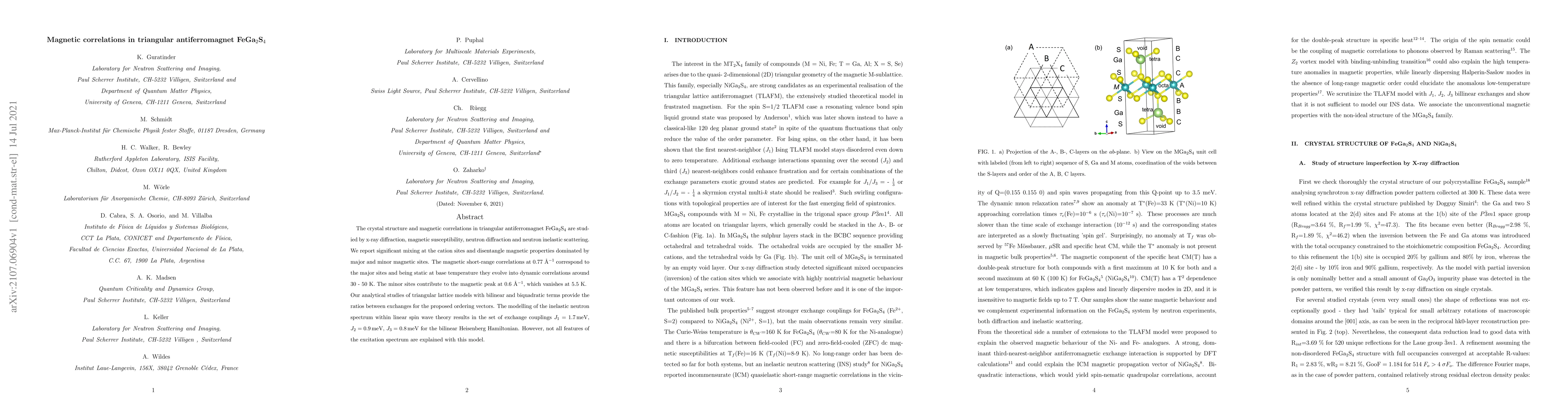 The crystal structure and magnetic correlations in triangular antiferromagnet FeGa$_2$S$_4$ are studied by x-ray diffraction, magnetic susceptibility, neutron diffraction and neutron inelastic scattering. We report significant mixing at the cation sites and disentangle magnetic properties dominated by major and minor magnetic sites. The magnetic short-range correlations at 0.77 \AA$^{-1}$ correspond to the major sites and being static at base temperature they evolve into dynamic correlations around 30 - 50 K. The minor sites contribute to the magnetic peak at 0.6 \AA$^{-1}$, which vanishes at 5.5 K. Our analytical studies of triangular lattice models with bilinear and biquadratic terms provide the ratios between exchanges for the proposed ordering vectors. The modelling of the inelastic neutron spectrum within linear spin wave theory results in the set of exchange couplings $J_1=1.7$\,meV, $J_2=0.9$\,meV, $J_3=0.8$\,meV for the bilinear Heisenberg Hamiltonian. However, not all features of the excitation spectrum are explained with this model.