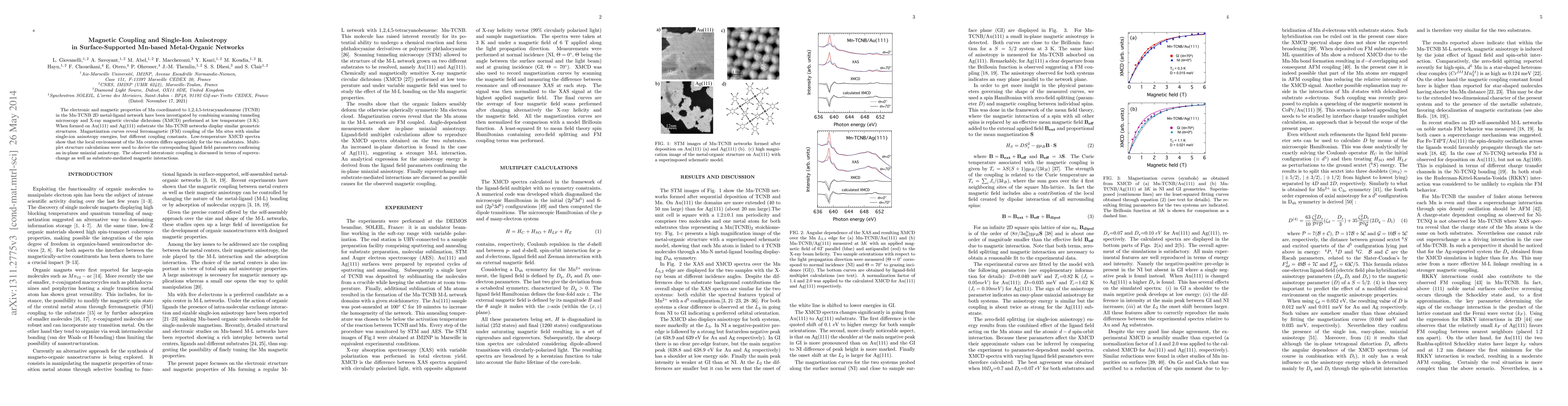 This study investigates the magnetic coupling and single-ion anisotropy in Mn-TCNB metal-organic networks on Au(111) and Ag(111) substrates, revealing ferromagnetic coupling and differing local environments for Mn centers, confirmed by XMCD and multiplet structure calculations.