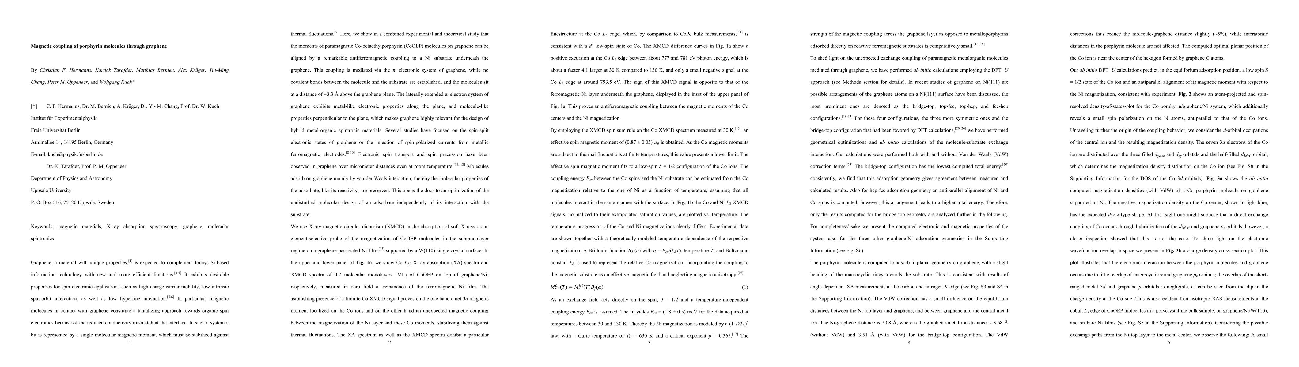 This study demonstrates that magnetic moments of Co-octaethylporphyrin molecules on graphene can be aligned through antiferromagnetic coupling to a Ni substrate, mediated by graphene's π electronic system, potentially advancing organic spin electronics. The alignment is achieved without forming covalent bonds, highlighting graphene's role in stabilizing molecular magnetic moments.