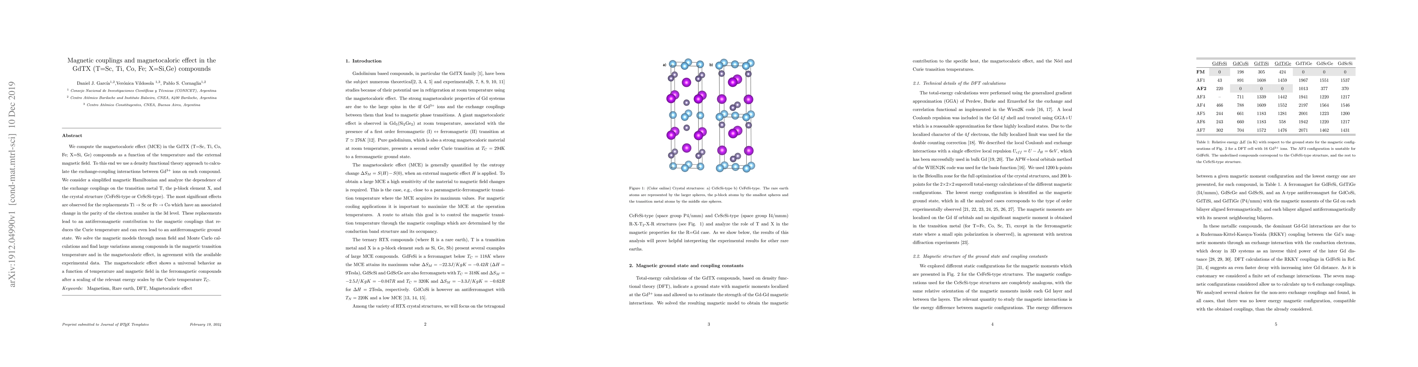We compute the magnetocaloric effect (MCE) in the GdTX (T=Sc, Ti, Co, Fe; X=Si, Ge) compounds as a function of the temperature and the external magnetic field. To this end we use a density functional theory approach to calculate the exchange-coupling interactions between Gd$^{3+}$ ions on each compound. We consider a simplified magnetic Hamiltonian and analyze the dependence of the exchange couplings on the transition metal T, the p-block element X, and the crystal structure (CeFeSi-type or CeScSi-type). The most significant effects are observed for the replacements Ti $\to$ Sc or Fe $\to$ Co which have an associated change in the parity of the electron number in the 3d level. These replacements lead to an antiferromagnetic contribution to the magnetic couplings that reduces the Curie temperature and can even lead to an antiferromagnetic ground state. We solve the magnetic models through mean field and Monte Carlo calculations and find large variations among compounds in the magnetic transition temperature and in the magnetocaloric effect, in agreement with the available experimental data. The magnetocaloric effect shows a universal behavior as a function of temperature and magnetic field in the ferromagnetic compounds after a scaling of the relevant energy scales by the Curie temperature $T_C$.