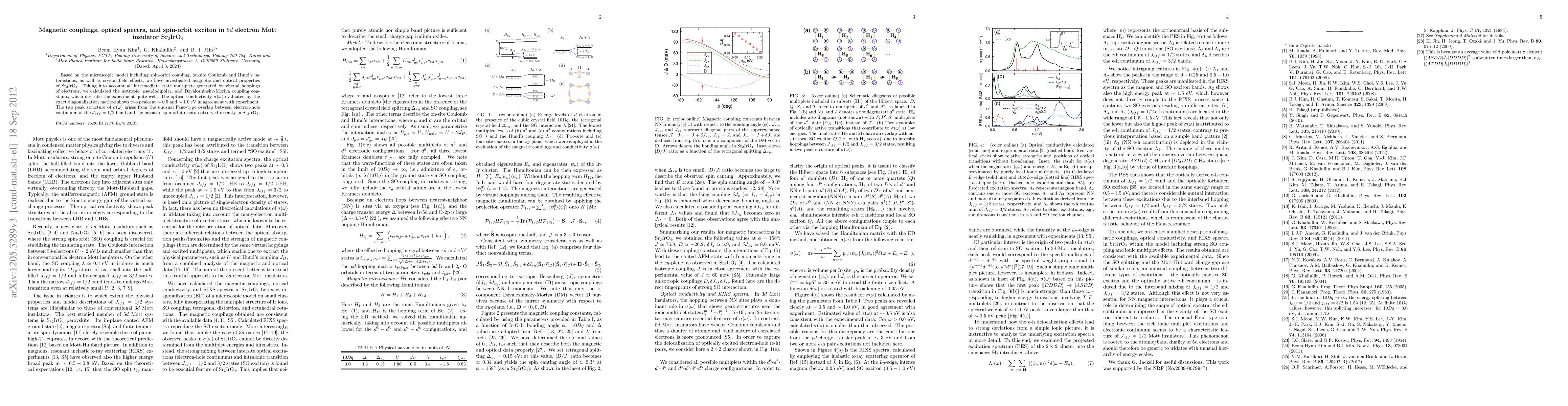 This study investigates the magnetic and optical properties of Sr2IrO4 using a microscopic model incorporating strong spin-orbit coupling, Coulomb interactions, and crystal field effects. The research calculates various magnetic coupling constants and optical conductivity, revealing two peaks in agreement with experimental data, attributed to the Fano-type overlap between the spin-orbit exciton and electron-hole continuum.