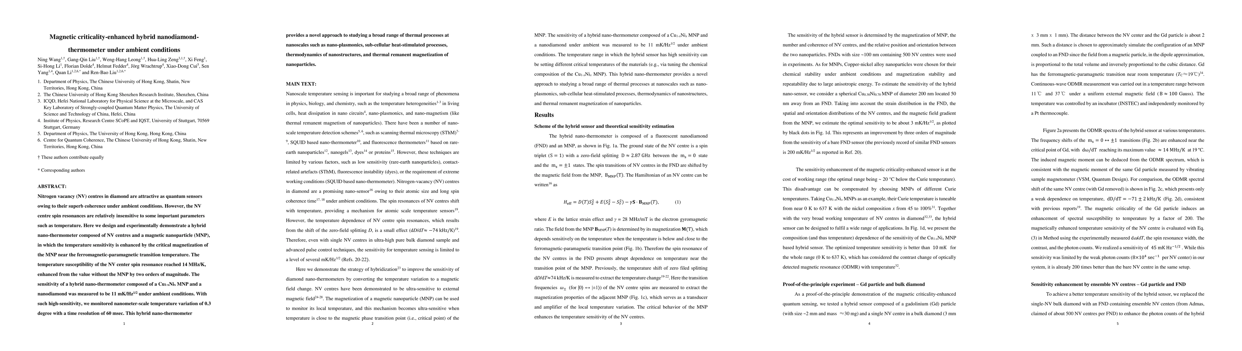 This paper presents a hybrid nano-thermometer combining nitrogen vacancy centres in diamond and magnetic nanoparticles, achieving significantly enhanced temperature sensitivity through magnetic criticality near the ferromagnetic-paramagnetic transition. The device monitors nanometer-scale temperature variations with high precision under ambient conditions.