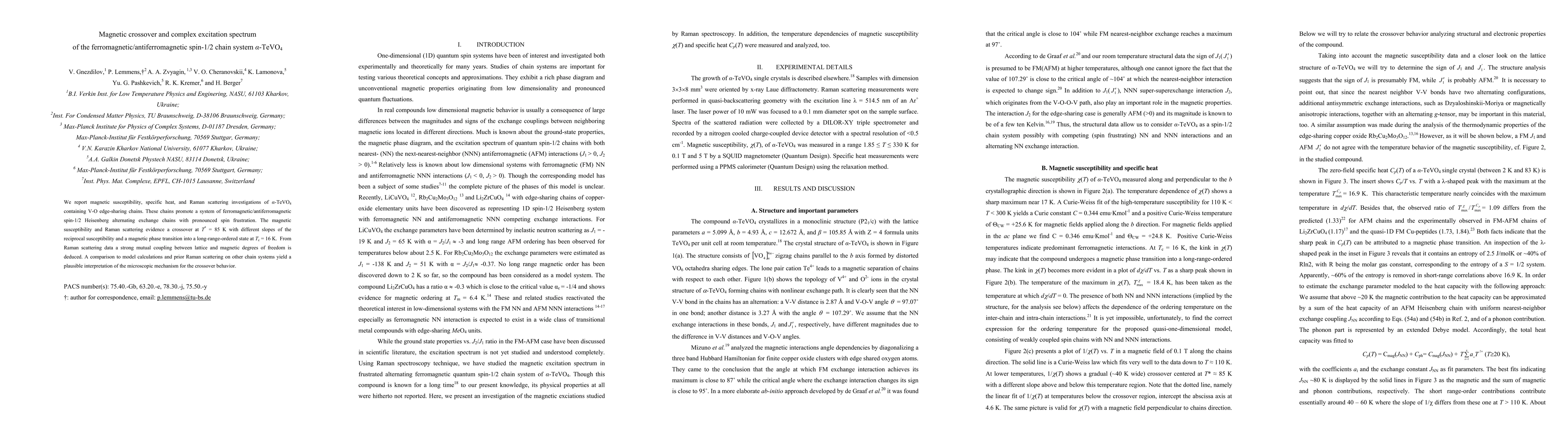 This study investigates alpha-TeVO4, a spin-1/2 chain system exhibiting ferromagnetic/antiferromagnetic interactions, revealing a magnetic crossover at T* = 85 K and a phase transition at Tc = 16 K. Raman scattering indicates strong lattice-magnetic coupling and supports a model explaining the complex excitation spectrum.