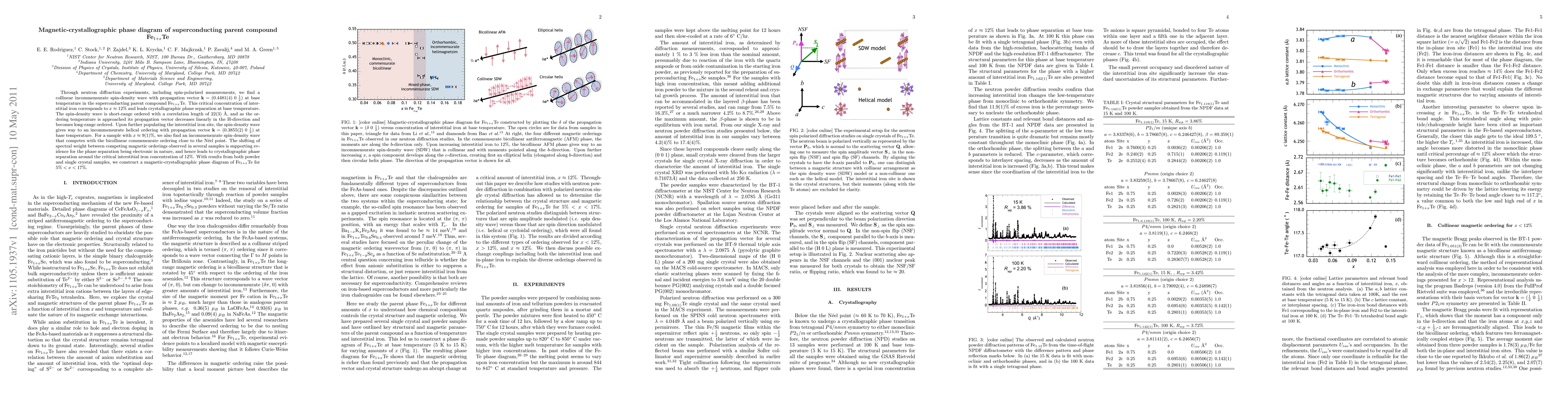 hrough neutron diffraction experiments, including spin-polarized measurements, we find a collinear incommensurate spin-density wave with propagation vector $ \mathbf k = $ ($0.4481(4) \, \,0 \, \, \frac1 2$) at base temperature in the superconducting parent compound Fe$_{1+x}$Te. This critical concentration of interstitial iron corresponds to $x \approx 12%$ and leads crystallographic phase separation at base temperature. The spin-density wave is short-range ordered with a correlation length of 22(3) \AA, and as the ordering temperature is approached its propagation vector decreases linearly in the H-direction and becomes long-range ordered. Upon further populating the interstitial iron site, the spin-density wave gives way to an incommensurate helical ordering with propagation vector $ \mathbf k =$ ($0.3855(2) \, \,0 \, \, \frac1 2$) at base temperature. For a sample with $x \approx 9(1) %$, we also find an incommensurate spin-density wave that competes with the bicollinear commensurate ordering close to the N\'eel point. The shifting of spectral weight between competing magnetic orderings observed in several samples is supporting evidence for the phase separation being electronic in nature, and hence leads to crystallographic phase separation around the critical interstitial iron concentration of 12%. With results from both powder and single crystal samples, we construct a magnetic-crystallographic phase diagram of Fe$_{1+x}$Te for $ 5% < x <17%$