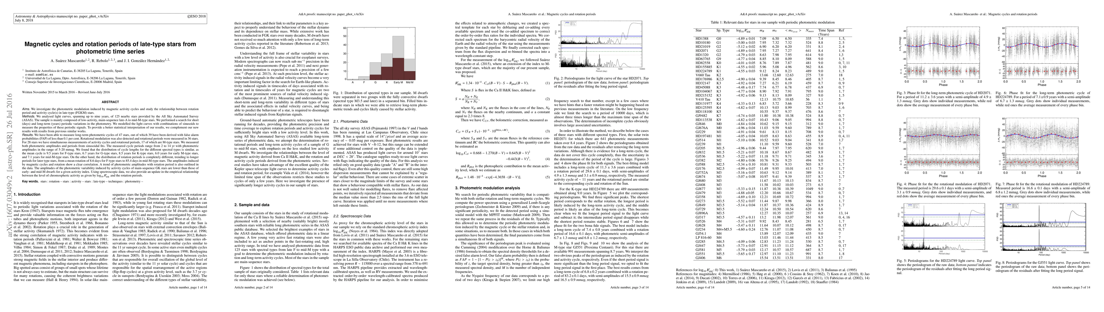 This study analyzes photometric time series data from 125 late-type stars (FGKM) to investigate magnetic activity cycles and their relationship with rotation periods. The research found long-term photometric cycles in 47 stars and rotational modulation in 36, revealing a correlation between photometric amplitudes and rotation periods, with longer periods for later-type stars.