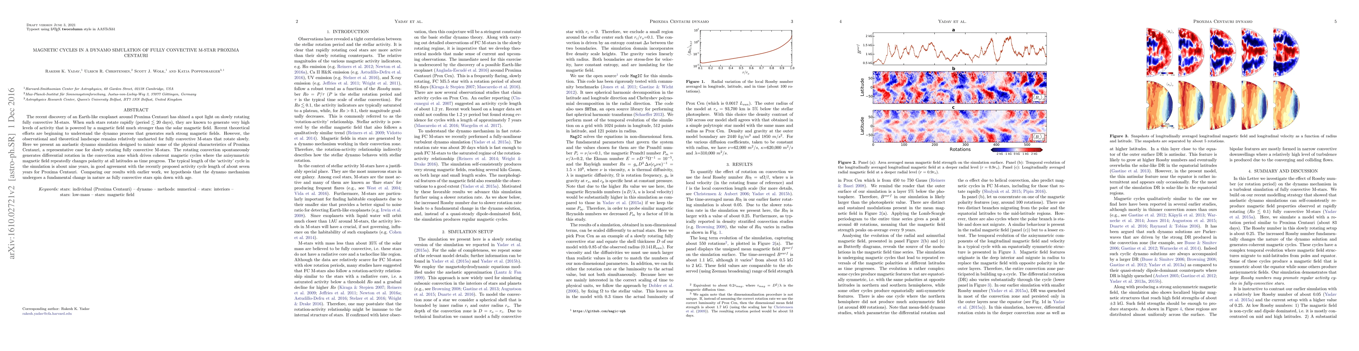 This paper presents an anelastic dynamo simulation of a slowly rotating, fully convective M-star like Proxima Centauri, revealing spontaneous differential rotation generating coherent magnetic cycles with a nine-year cycle length, consistent with observations. The study suggests a fundamental change in the dynamo mechanism as these stars age and spin down.