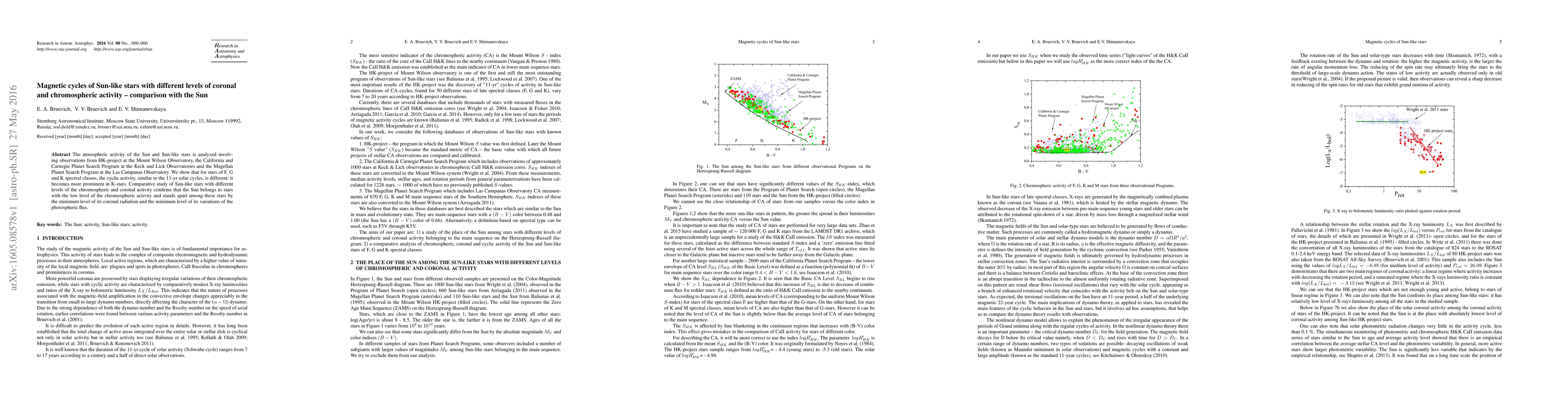 This paper compares the magnetic activity of Sun-like stars (F, G, and K spectral classes) to the Sun, revealing that the cyclic activity varies significantly among these stars, with K-stars showing more prominent cycles. The Sun is identified as having the lowest chromospheric activity and minimal coronal radiation and photospheric flux variations among these stars.