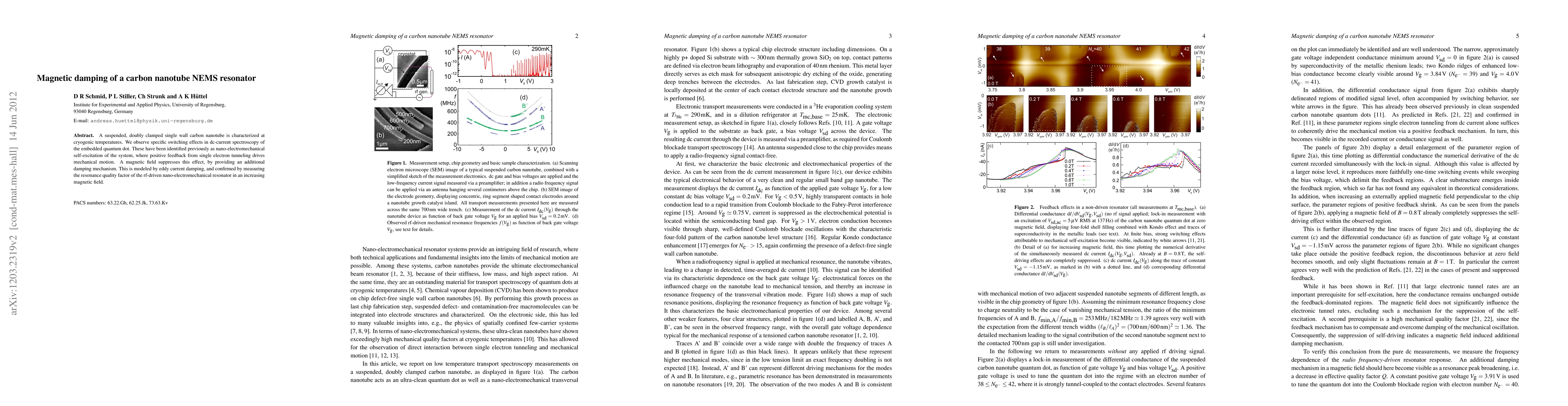 This study investigates the magnetic damping of a carbon nanotube NEMS resonator, showing that a magnetic field suppresses nano-electromechanical self-excitation through eddy current damping, which is confirmed by measuring the resonance quality factor under increasing magnetic fields.