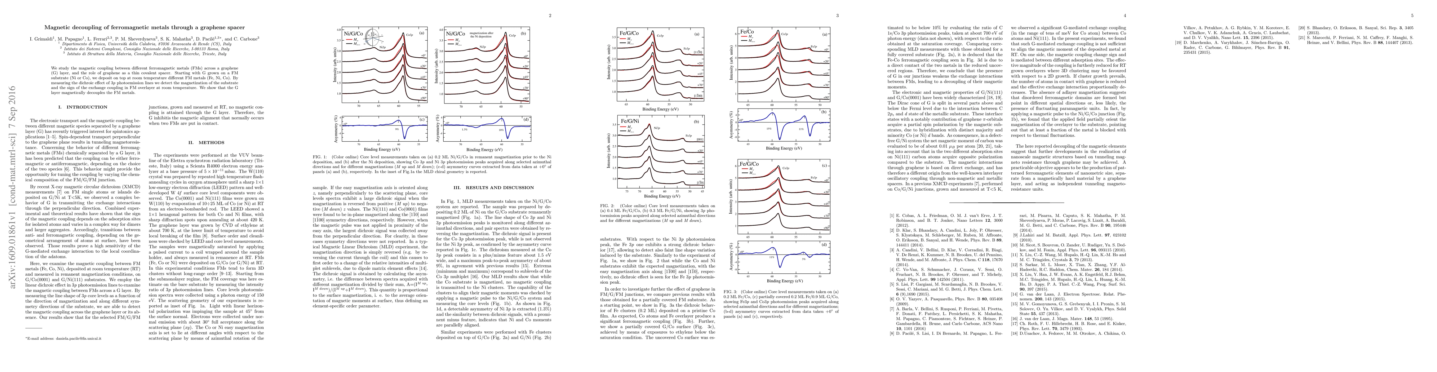 This paper investigates the magnetic coupling between ferromagnetic metals across a graphene layer, demonstrating that graphene acts as an effective magnetic spacer, decoupling the magnetic interactions between different ferromagnetic metals deposited on top. The study uses dichroic effect measurements to observe the magnetization and exchange coupling at room temperature.