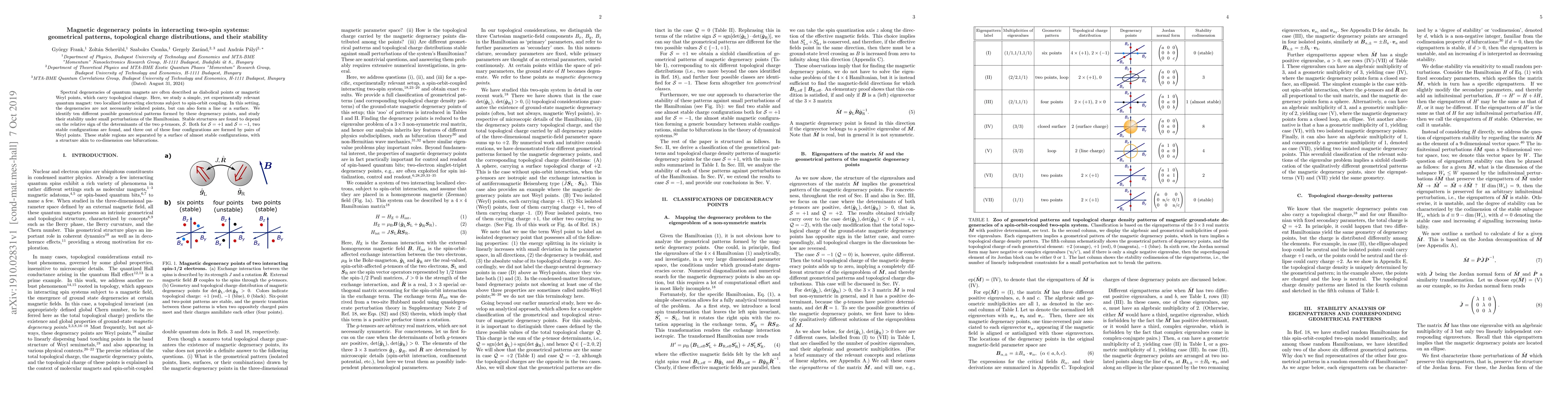 Spectral degeneracies of quantum magnets are often described as diabolical points or magnetic Weyl points, which carry topological charge. Here, we study a simple, yet experimentally relevant quantum magnet: two localized interacting electrons subject to spin-orbit coupling. In this setting, the degeneracies are not necessarily isolated points, but can also form a line or a surface. We identify ten different possible geometrical patterns formed by these degeneracy points, and study their stability under small perturbations of the Hamiltonian. Stable structures are found to depend on the relative sign of the determinants of the two $g$-tensors, $\cal S$. Both for ${\cal S}=+1$ and ${\cal S}=-1$, two stable configurations are found, and three out of these four configurations are formed by pairs of Weyl points. These stable regions are separated by a surface of almost stable configurations, with a structure akin to co-dimension one bifurcations.