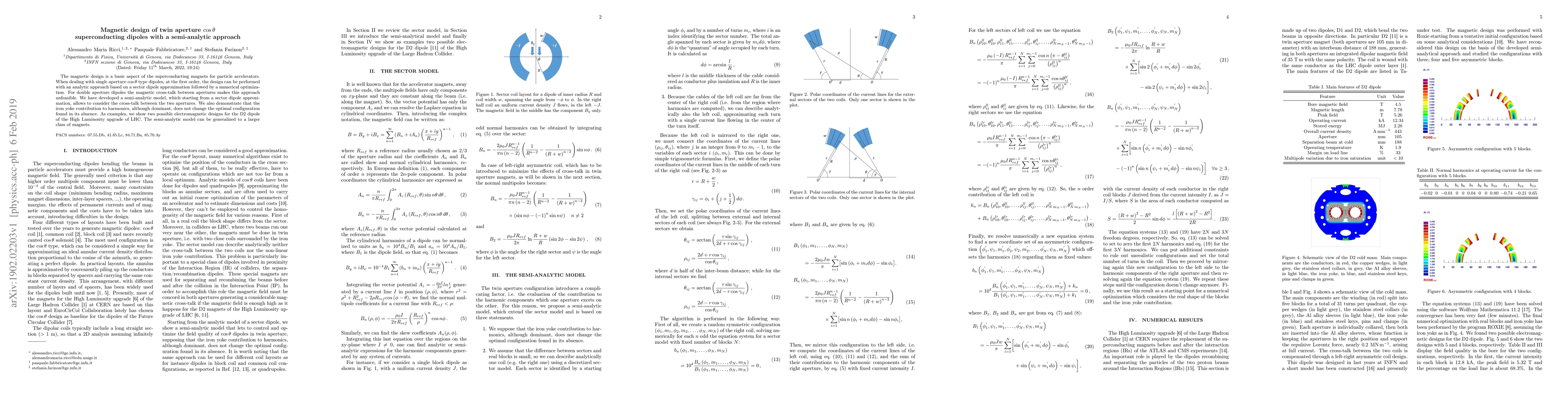 The magnetic design is a basic aspect of the superconducting magnets for particle accelerators. When dealing with single aperture cos-theta type dipoles, at the first order, the design can be performed with an analytic approach based on a sector dipole approximation followed by a numerical optimization. For double aperture dipoles the magnetic cross-talk between apertures makes this approach unfeasible. We have developed a semi-analytic model, which starting from a sector dipole approximation, allows to consider the cross-talk between the two apertures. We also demonstrate that the iron yoke contribution to harmonics, although dominant, does not change the optimal configuration found in its absence. As examples, we show two possible electromagnetic designs for the D2 dipole of the High Luminosity upgrade of LHC. The semi-analytic model can be generalized to a larger class of magnets.