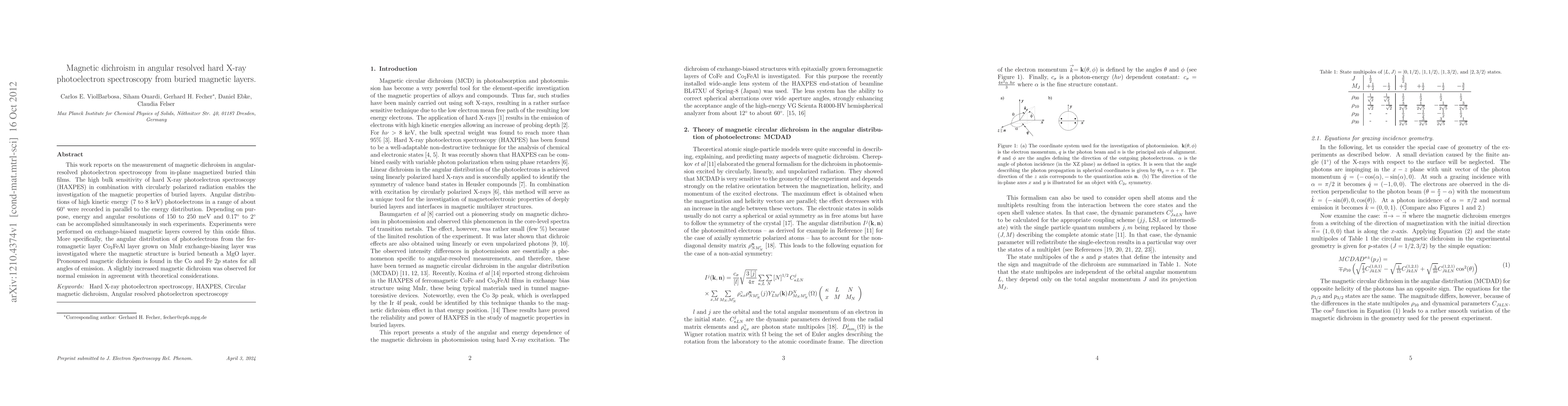 This study investigates magnetic dichroism in angular-resolved hard X-ray photoelectron spectroscopy from buried magnetic layers, revealing pronounced dichroism in Co and Fe 2p states, with slightly increased dichroism for normal emission, as observed in Co2FeAl layers on MnIr exchange-biasing layers.