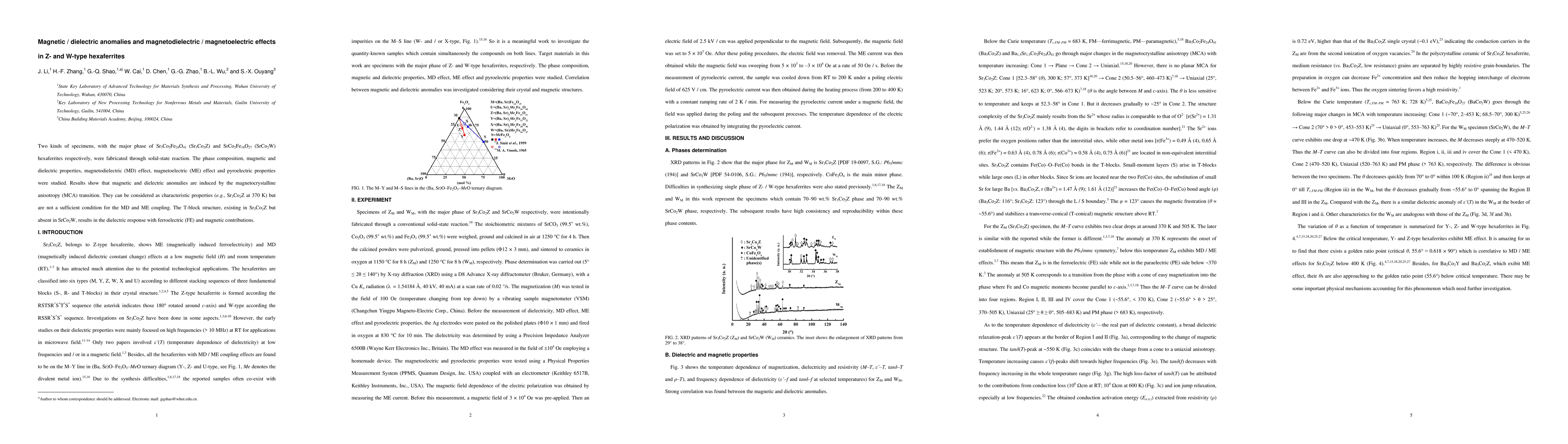 Two kinds of specimens, with the major phase of Sr3Co2Fe24O41 (Sr3Co2Z) and SrCo2Fe16O27 (SrCo2W) hexaferrites respectively, were fabricated through solid-state reaction. The phase composition, magnetic and dielectric properties, magnetodielectric (MD) effect, magnetoelectric (ME) effect and pyroelectric properties were studied. Results show that magnetic and dielectric anomalies are induced by the magnetocrystalline anisotropy (MCA) transition. They can be considered as characteristic properties (e.g., Sr3Co2Z at 370 K) but are not a sufficient condition for the MD and ME coupling. The T-block structure, existing in Sr3Co2Z but absent in SrCo2W, results in the dielectric response with ferroelectric (FE) and magnetic contributions.