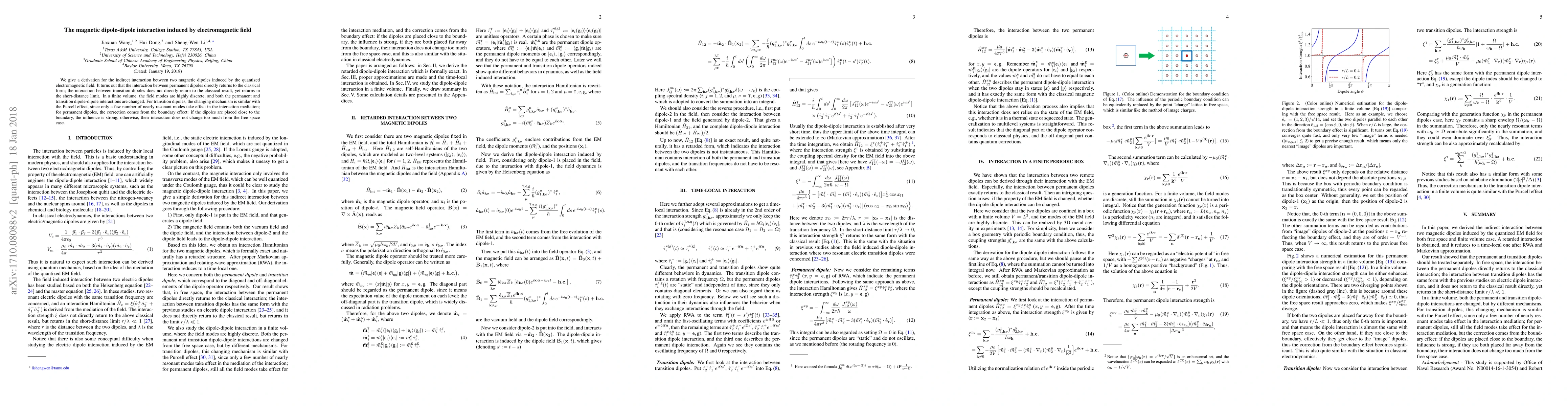We give a derivation for the indirect interaction between two magnetic dipoles induced by the quantized electromagnetic field. It turns out that the interaction between permanent dipoles directly returns to the classical form; the interaction between transition dipoles does not directly return to the classical result, yet returns in the short-distance limit. In a finite volume, the field modes are highly discrete, and both the permanent and transition dipole-dipole interactions are changed. For transition dipoles, the changing mechanism is similar with the Purcell effect, since only a few number of nearly resonant modes take effect in the interaction mediation; for permanent dipoles, the correction comes from the boundary effect: if the dipoles are placed close to the boundary, the influence is strong, otherwise, their interaction does not change too much from the free space case.