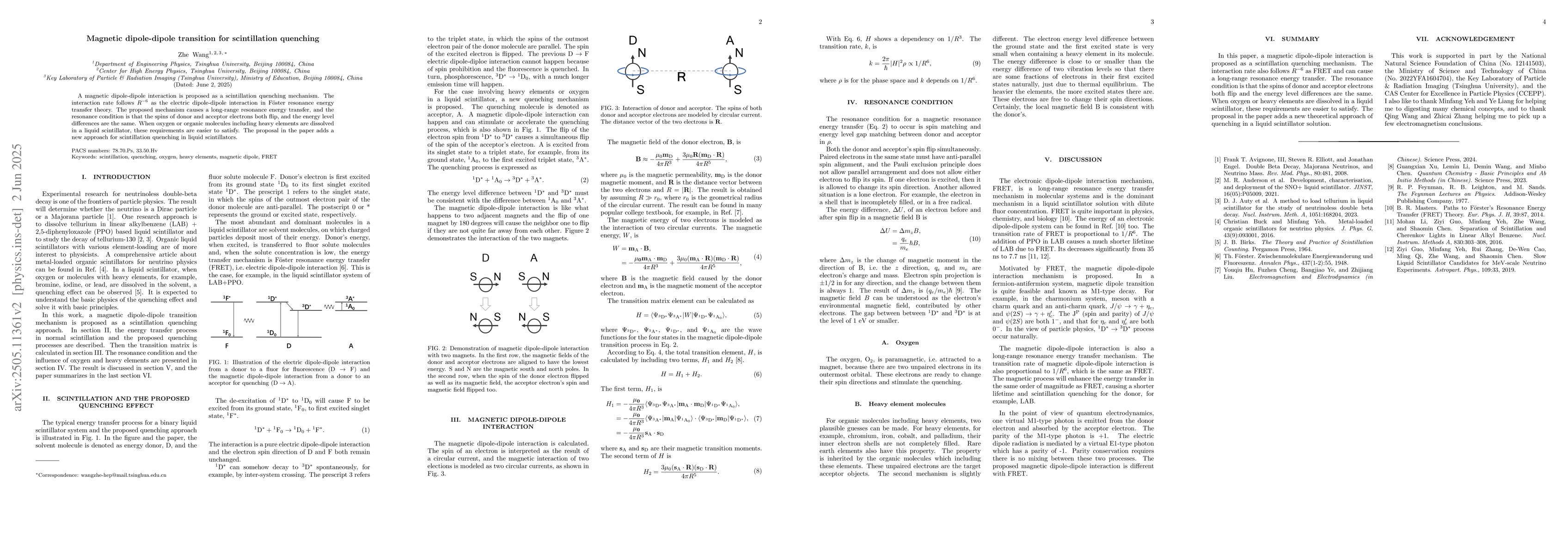 The paper presents a theoretical framework for magnetic dipole-dipole resonance energy transfer as a quenching mechanism for heavy elements in liquid scintillators.