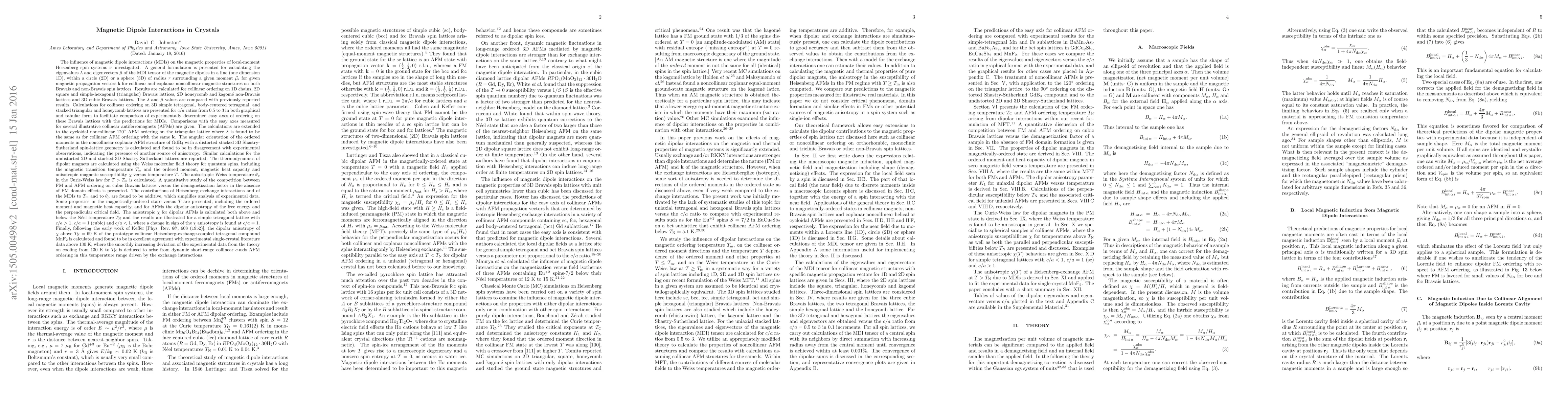 The influence of magnetic dipole interactions (MDIs) on the magnetic properties of local-moment spin systems is investigated. The eigenvalues and eigenvectors of the MDI tensor are determined for a wide variety of spin lattices and magnetic wavevectors in the magnetically ordered state with collinear moment alignments. The predicted easy axes in the ordered state are compared with experimental results for antiferromagnetic (AFM) compounds. The theory is generalized to include noncollinear AFM structures and compared with experiments. Many properties caused or influenced by MDIs in the ordered and paramagnetic states are calculated within Weiss molecular field theory.