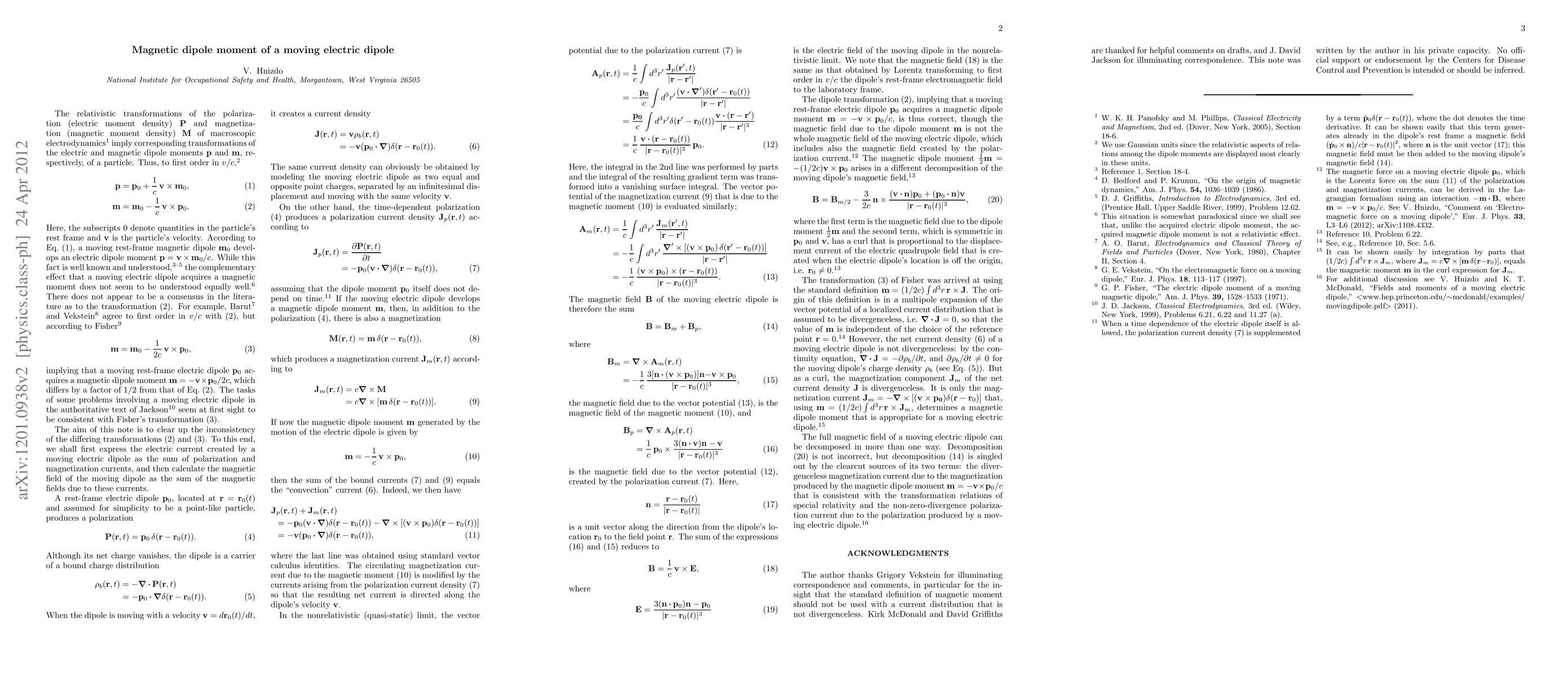 Summary: This paper explores the magnetic field generated by a moving electric dipole, showing it can be decomposed into polarization and magnetization currents, and demonstrates that the resulting magnetic dipole moment aligns with relativistic transformations in electrodynamics.