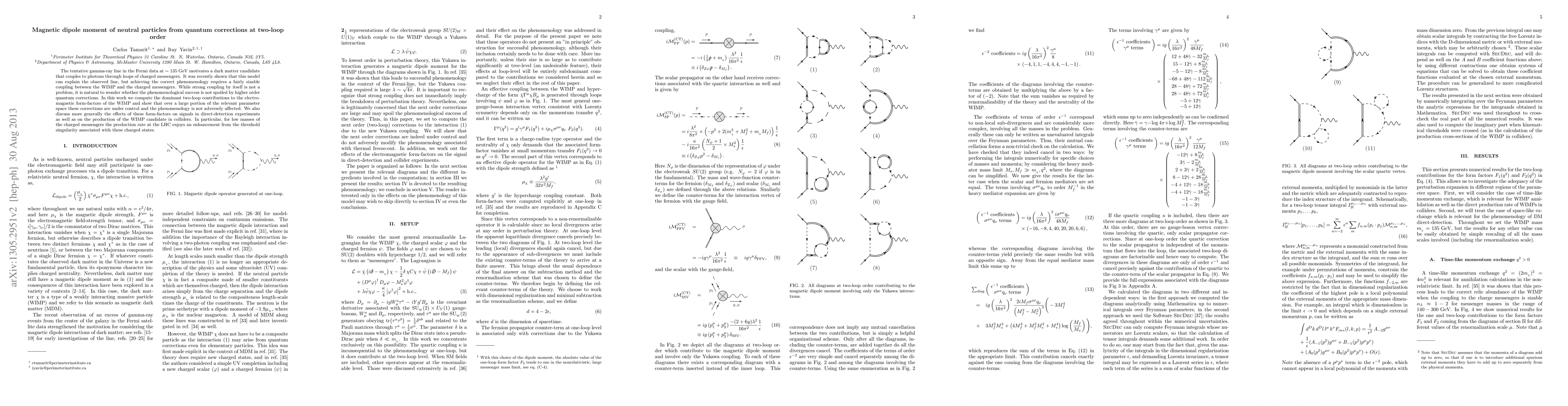 The tentative gamma-ray line in the Fermi data at ~135 GeV motivates a dark matter candidate that couples to photons through loops of charged messengers. It was recently shown that this model can explain the observed line, but achieving the correct phenomenology requires a fairly sizable coupling between the WIMP and the charged messengers. While strong coupling by itself is not a problem, it is natural to wonder whether the phenomenological success is not spoiled by higher order quantum corrections. In this work we compute the dominant two-loop contributions to the electromagnetic form-factors of the WIMP and show that over a large portion of the relevant parameter space these corrections are under control and the phenomenology is not adversely affected. We also discuss more generally the effects of these form-factors on signals in direct-detection experiments as well as on the production of the WIMP candidate in colliders. In particular, for low masses of the charged messengers the production rate at the LHC enjoys an enhancement from the threshold singularity associated with these charged states.