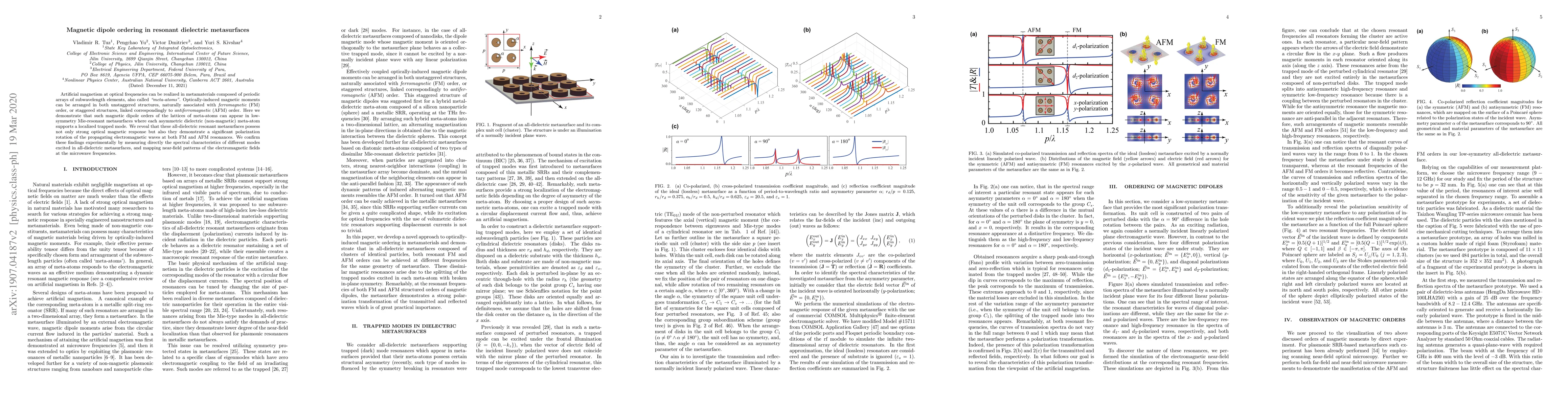 This paper demonstrates the magnetic dipole ordering in low-symmetry Mie-resonant dielectric metasurfaces, showing strong optical magnetic response and significant polarization rotation at both ferromagnetic and antiferromagnetic resonances. Experimental validation includes spectral measurements and near-field electromagnetic field mapping at microwave frequencies.