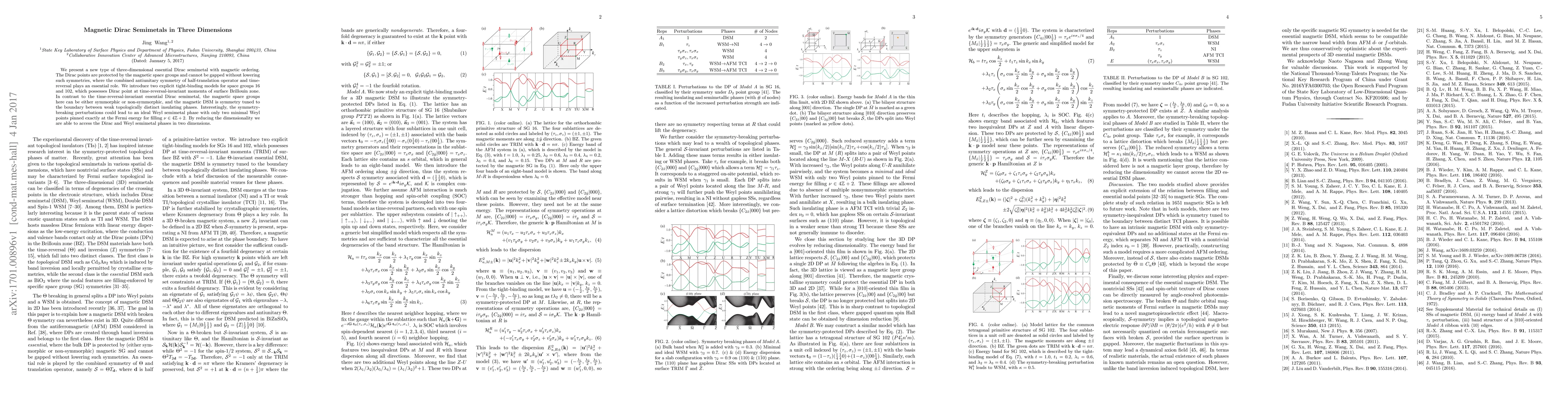 This research introduces a novel three-dimensional magnetic Dirac semimetal characterized by protected Dirac points under magnetic space groups, with potential to transition into a Weyl semimetal phase via symmetry-breaking perturbations. Two tight-binding models for space groups 16 and 102 illustrate the material's properties.
