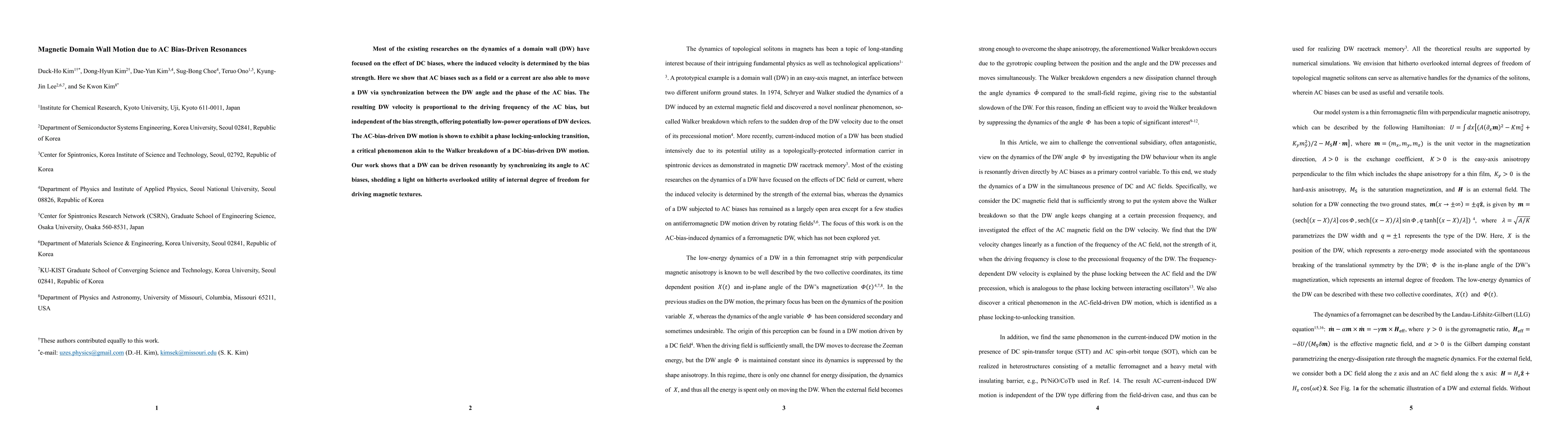 This paper explores the motion of a magnetic domain wall driven by AC biases, demonstrating that synchronization with the AC bias phase can induce DW motion. Unlike DC-driven DWs, AC-driven DW motion velocity is frequency-dependent but independent of bias strength, suggesting low-power operation potential.