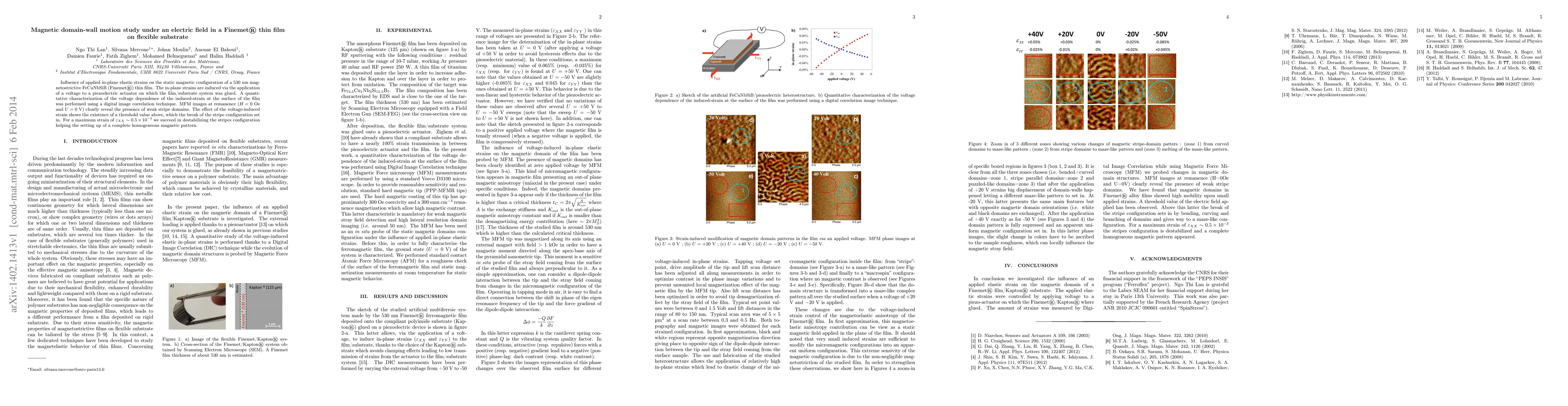 This study investigates the impact of in-plane elastic strains on the magnetic domain-wall motion in a magnetostrictive FeCuNbSiB thin film on a flexible substrate, induced by voltage-applied piezoelectric actuators. The results show that above a critical strain threshold, the applied strain can destabilize stripe domain configurations, leading to a homogeneous magnetic pattern.