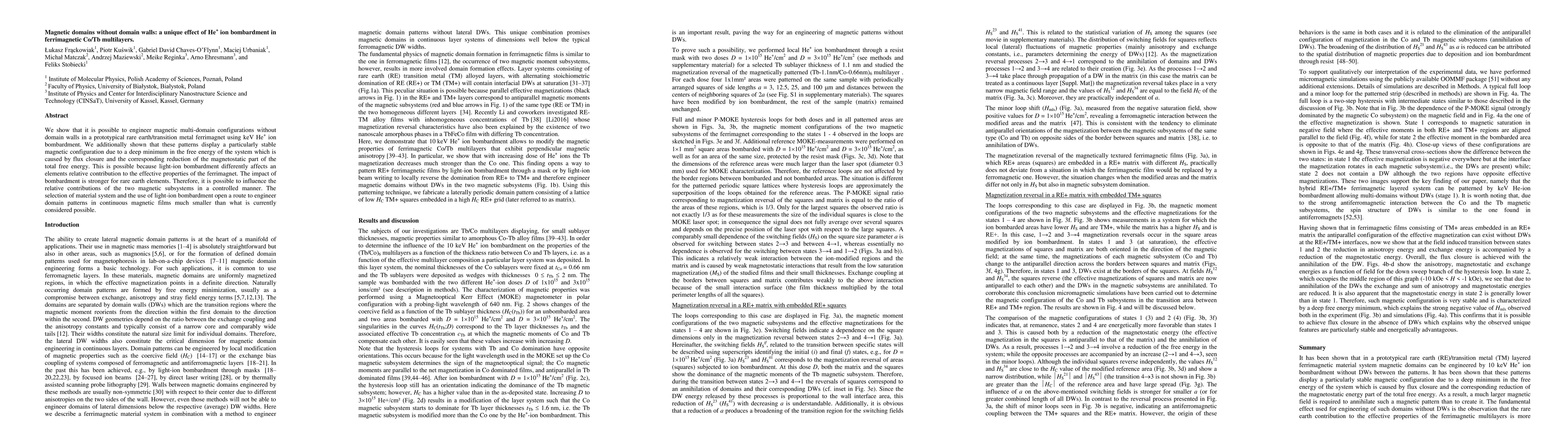 This research demonstrates that keV He+ ion bombardment can create magnetic multi-domain configurations without domain walls in Co/Tb multilayers, a rare earth/transition metal ferrimagnet. The stable magnetic patterns result from a deep energy minimum due to flux closure, enabling the engineering of smaller magnetic domain patterns than previously possible.
