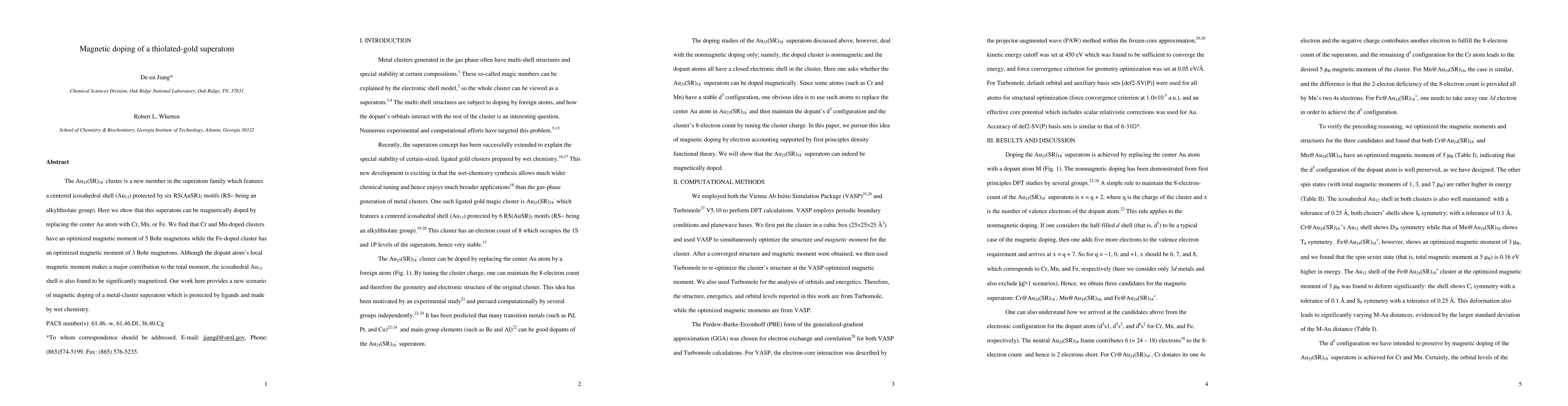 This paper investigates the magnetic doping of the Au25(SR)18- superatom cluster by replacing its central Au atom with Cr, Mn, or Fe, finding optimized magnetic moments of 5 Bohr magnetons for Cr and Mn doping, and 3 Bohr magnetons for Fe doping. The study reveals that the icosahedral Au12 shell also contributes significantly to the magnetization, offering a novel approach to magnetic doping in metal-cluster superatoms.