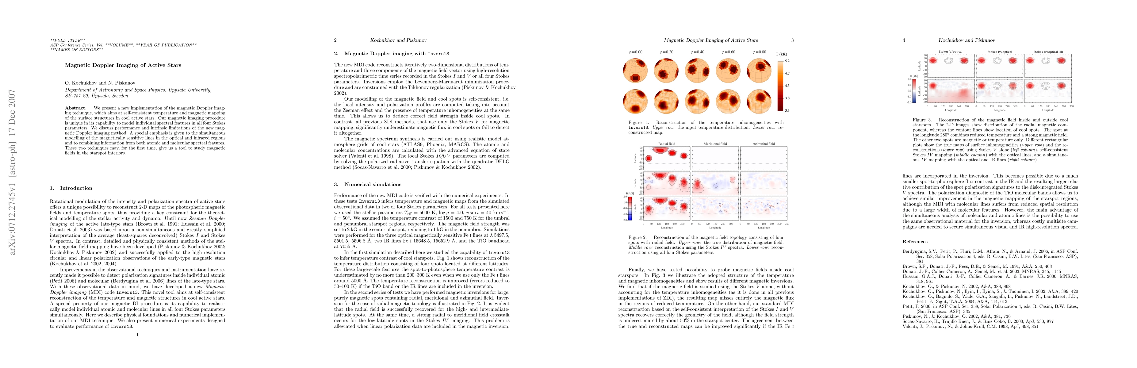 This paper introduces a novel magnetic Doppler imaging technique for mapping temperature and magnetic fields on active stars, capable of modeling individual spectral features across all four Stokes parameters. The method's potential to simultaneously analyze magnetically sensitive lines in optical and infrared regions, along with atomic and molecular features, offers a new tool for studying magnetic fields within starspot interiors.