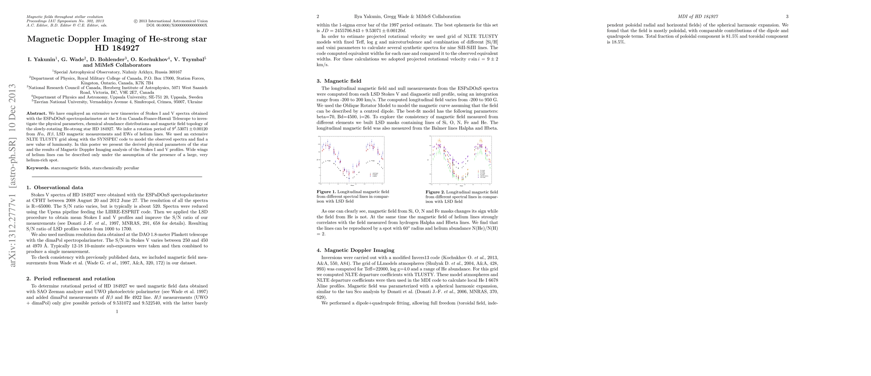 We have employed an extensive new timeseries of Stokes I and V spectra obtained with the ESPaDOnS spectropolarimeter at the 3.6-m Canada-France-Hawaii Telescope to investigate the physical parameters, chemical abundance distributions and magnetic field topology of the slowly-rotating He-strong star HD 184927. We infer a rotation period of 9.53071+-0.00120 from H-alpha, H-beta, LSD magnetic measurements and EWs of helium lines. We used an extensive NLTE TLUSTY grid along with the SYNSPEC code to model the observed spectra and find a new value of luminosity. In this poster we present the derived physical parameters of the star and the results of Magnetic Doppler Imaging analysis of the Stokes I and V profiles. Wide wings of helium lines can be described only under the assumption of the presence of a large, very helium-rich spot.