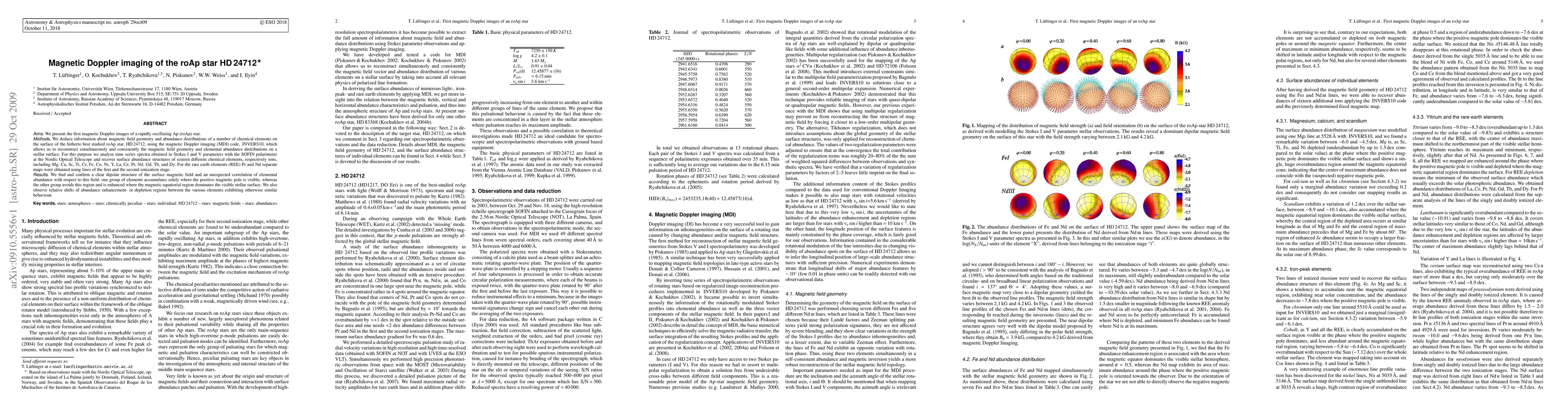 This paper presents the first magnetic Doppler images of the roAp star HD 24712, revealing a clear dipolar magnetic field and correlating elemental abundances with the magnetic field geometry. The study identifies distinct accumulation patterns for different chemical elements, suggesting complex interactions between magnetic fields and surface chemistry.