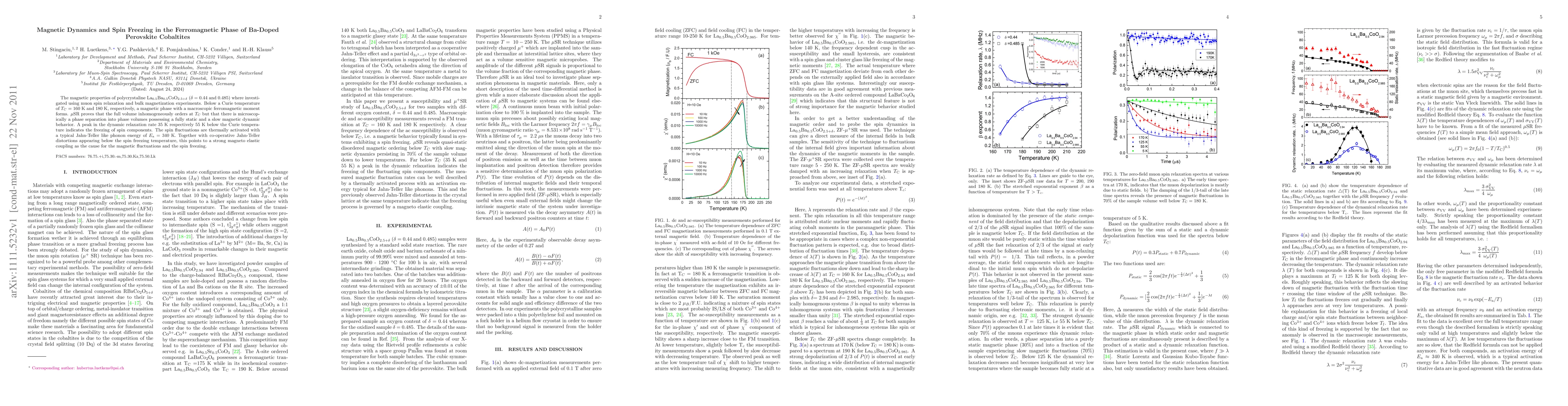 Researchers investigated magnetic properties of Ba-doped perovskite cobaltites using muon spin relaxation and bulk magnetization experiments. They found a ferromagnetic phase with microscopic phase separation into static and dynamic behavior, indicating strong magnetoelastic coupling and thermal activation of spin fluctuations.