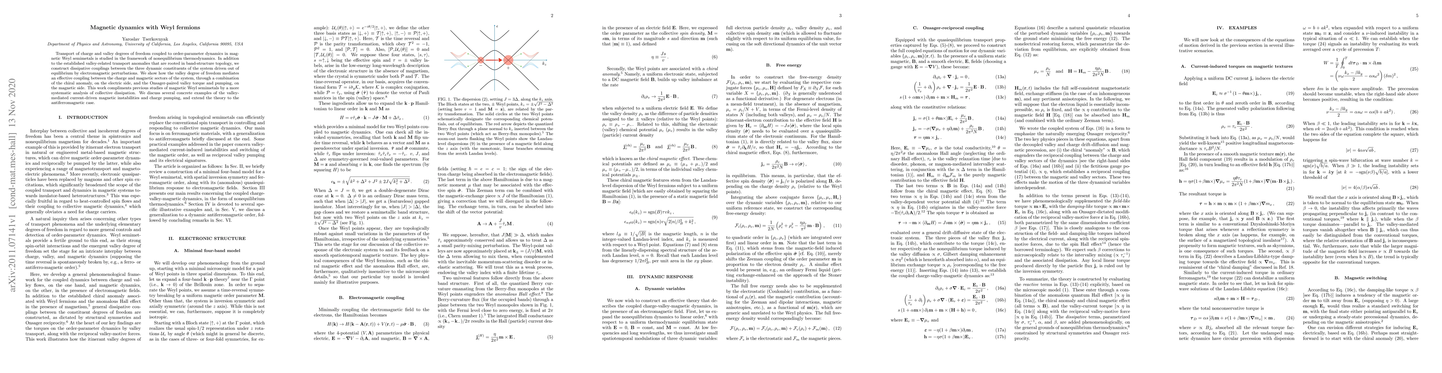 Transport of charge and valley degrees of freedom coupled to order-parameter dynamics in magnetic Weyl semimetals is studied in the framework of nonequilibrium thermodynamics. In addition to the established valley-related transport anomalies that are rooted in band-structure topology, we construct dissipative couplings between the three dynamic constituents of the system driven out of equilibrium by electromagnetic perturbations. We show how the valley degree of freedom mediates an effective coupling between the charge and magnetic sectors of the system, through a combination of the chiral anomaly, on the electric side, and the Onsager-paired valley torque and pumping, on the magnetic side. This work compliments previous studies of magnetic Weyl semimetals by a more systematic analysis of collective dissipation. We discuss several concrete examples of the valley-mediated current-driven magnetic instabilities and charge pumping, and extend the theory to the antiferromagnetic case.