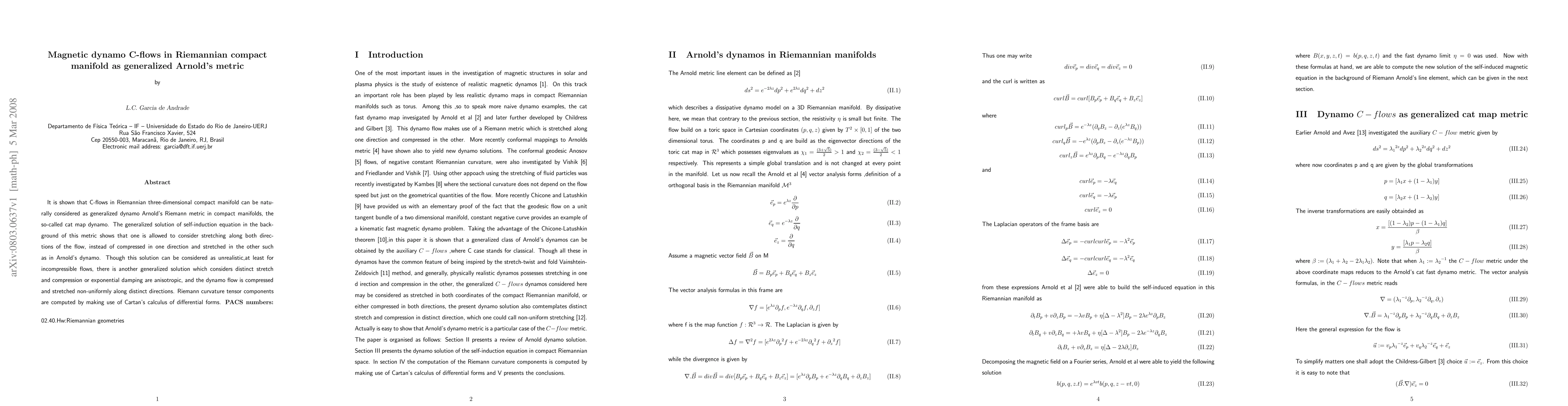 It is shown that C-flows in Riemannian three-dimensional compact manifold can be naturally considered as generalized dynamo Arnold's metric in compact manifolds, the so-called cat map dynamo. The generalized solution of self-induction equation in the background of this metric shows that one is allowed to consider stretching along both directions of the flow, instead of compressed in one direction and stretched in the other such as in Arnold's dynamo. Though this solution can be considered as unrealistic,at least for incompressible flows, there is another generalized solution which considers distinct stretch and compression intensities along distinct directions. Curvature tensor components are computed by making use of calculus of differential forms.