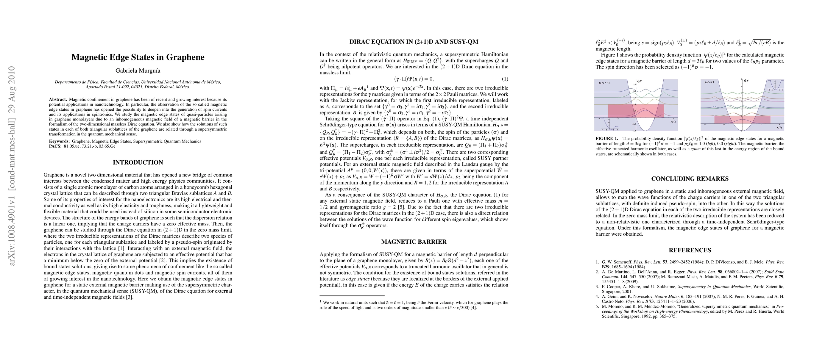 This paper investigates magnetic edge states in graphene induced by an inhomogeneous magnetic field, highlighting their potential for spin current generation and applications in spintronics. It utilizes the two-dimensional massless Dirac equation to explore these quasi-particles and demonstrates a supersymmetric relationship between states in graphene's triangular sublattices.