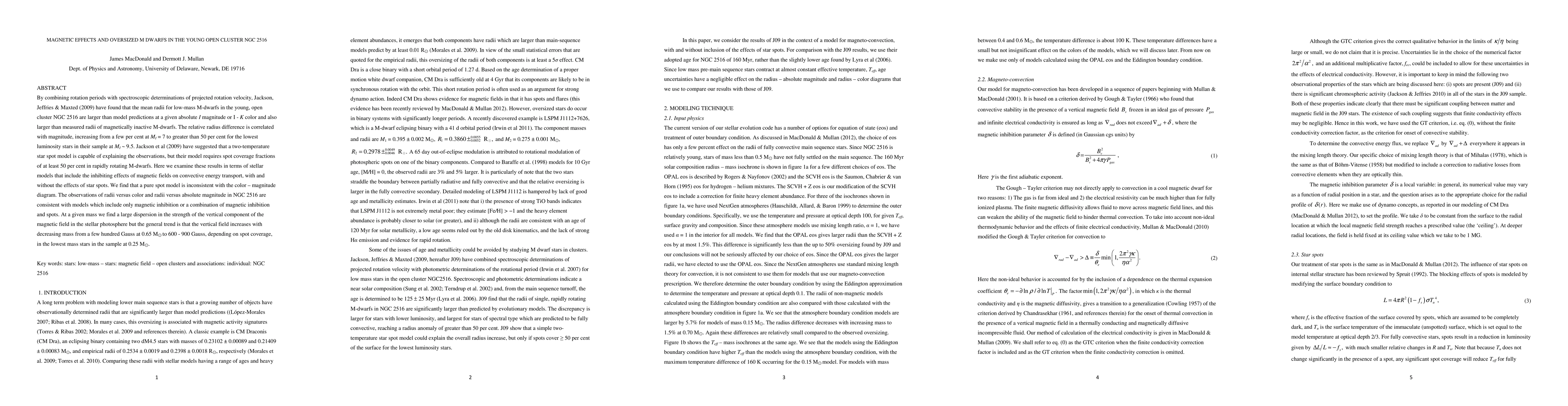 By combining rotation periods with spectroscopic determinations of projected rotation velocity, Jackson, Jeffries & Maxted (2009) have found that the mean radii for low-mass M-dwarfs in the young, open cluster NGC 2516 are larger than model predictions at a given absolute I magnitude or I - K color and also larger than measured radii of magnetically inactive M-dwarfs. The relative radius difference is correlated with magnitude, increasing from a few per cent at MI = 7 to greater than 50 per cent for the lowest luminosity stars in their sample at MI about 9.5. Jackson et al (2009) have suggested that a two-temperature star spot model is capable of explaining the observations, but their model requires spot coverage fractions of at least 50 per cent in rapidly rotating M-dwarfs. Here we examine these results in terms of stellar models that include the inhibiting effects of magnetic fields on convective energy transport, with and without the effects of star spots. We find that a pure spot model is inconsistent with the color - magnitude diagram. The observations of radii versus color and radii versus absolute magnitude in NGC 2516 are consistent with models which include only magnetic inhibition or a combination of magnetic inhibition and spots. At a given mass we find a large dispersion in the strength of the vertical component of the magnetic field in the stellar photosphere but the general trend is that the vertical field increases with decreasing mass from a few hundred Gauss at 0.65 Msun to 600 - 900 Gauss, depending on spot coverage, in the lowest mass stars in the sample at 0.25 Msun.