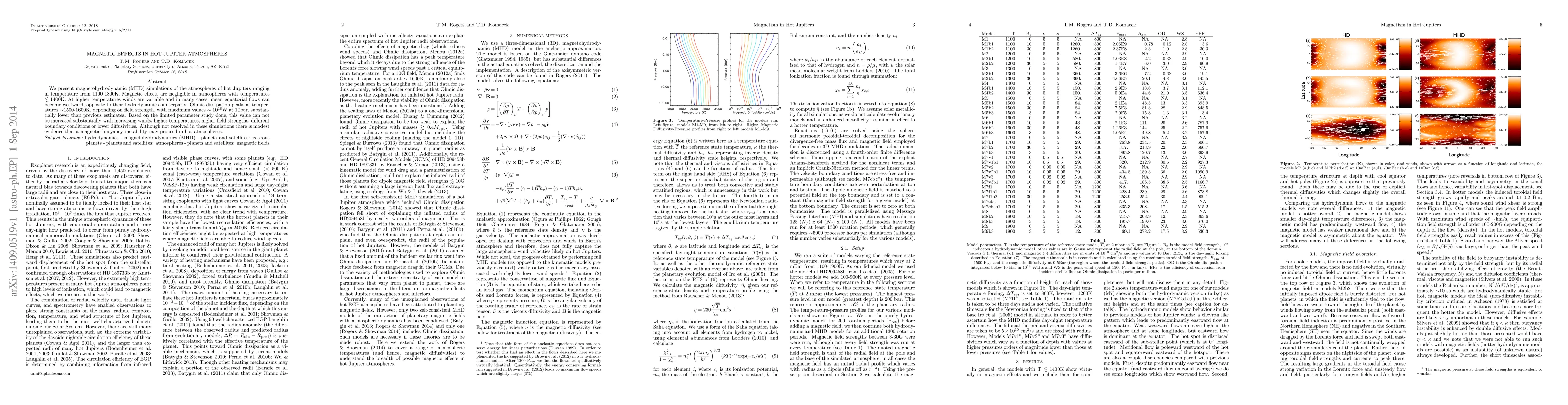 We present magnetohydrodynamic (MHD) simulations of the atmospheres of hot Jupiters ranging in temperature from 1100-1800K. Magnetic effects are negligible in atmospheres with temperatures $\lesssim$ 1400K. At higher temperatures winds are variable and in many cases, mean equatorial flows can become westward, opposite to their hydrodynamic counterparts. Ohmic dissipation peaks at temperatures $\sim$1500-1600K, depending on field strength, with maximum values $\sim 10^{18}$W at 10bar, substantially lower than previous estimates. Based on the limited parameter study done, this value can not be increased substantially with increasing winds, higher temperatures, higher field strengths, different boundary conditions or lower diffusivities. Although not resolved in these simulations there is modest evidence that a magnetic buoyancy instability may proceed in hot atmospheres.