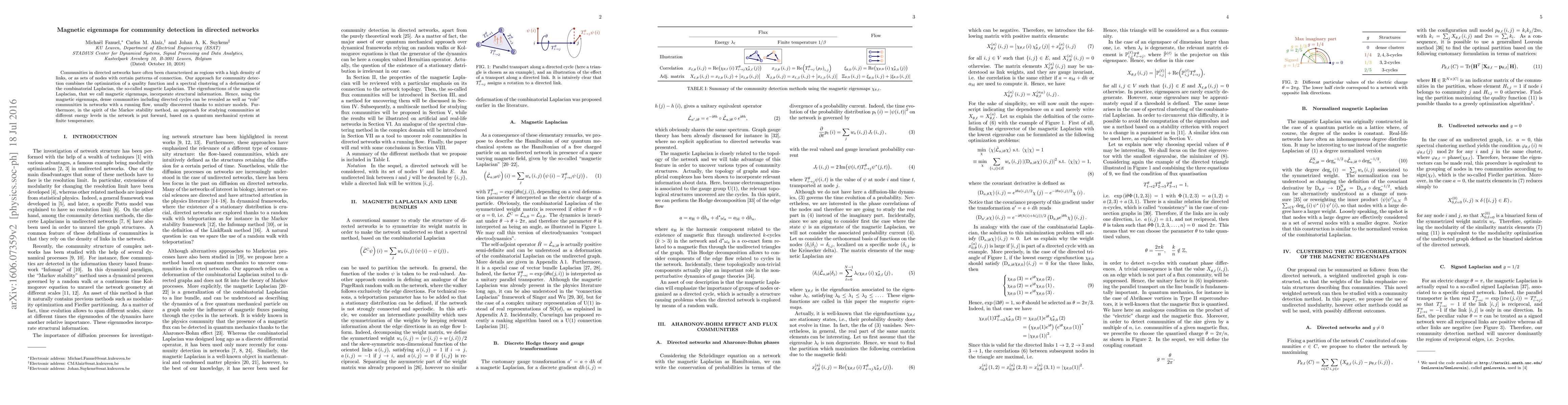 Communities in directed networks have often been characterized as regions with a high density of links, or as sets of nodes with certain patterns of connection. Our approach for community detection combines the optimization of a quality function and a spectral clustering of a deformation of the combinatorial Laplacian, the so-called magnetic Laplacian. The eigenfunctions of the magnetic Laplacian, that we call magnetic eigenmaps, incorporate structural information. Hence, using the magnetic eigenmaps, dense communities including directed cycles can be revealed as well as "role" communities in networks with a running flow, usually discovered thanks to mixture models. Furthermore, in the spirit of the Markov stability method, an approach for studying communities at different energy levels in the network is put forward, based on a quantum mechanical system at finite temperature.