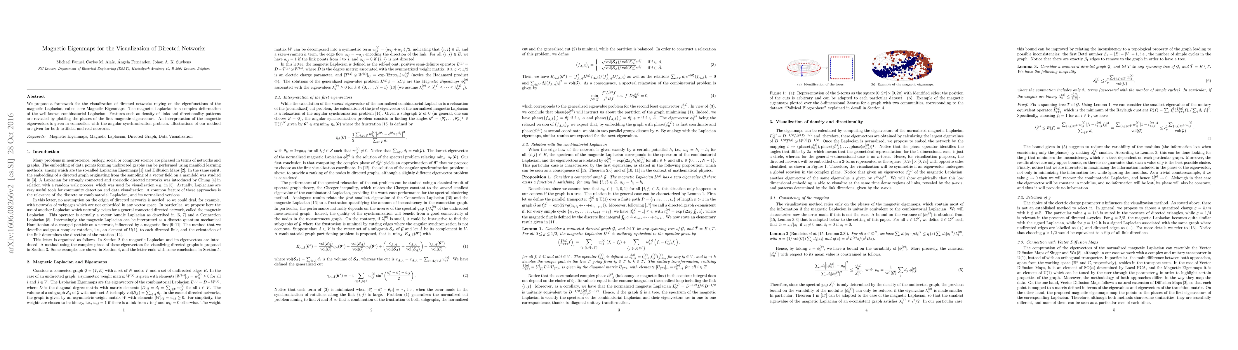 The research proposes Magnetic Eigenmaps, a visualization framework for directed networks based on the eigenfunctions of the magnetic Laplacian. This method reveals network features like link density and directionality patterns through the phases of the first magnetic eigenvectors, interpreted in connection with the angular synchronization problem.