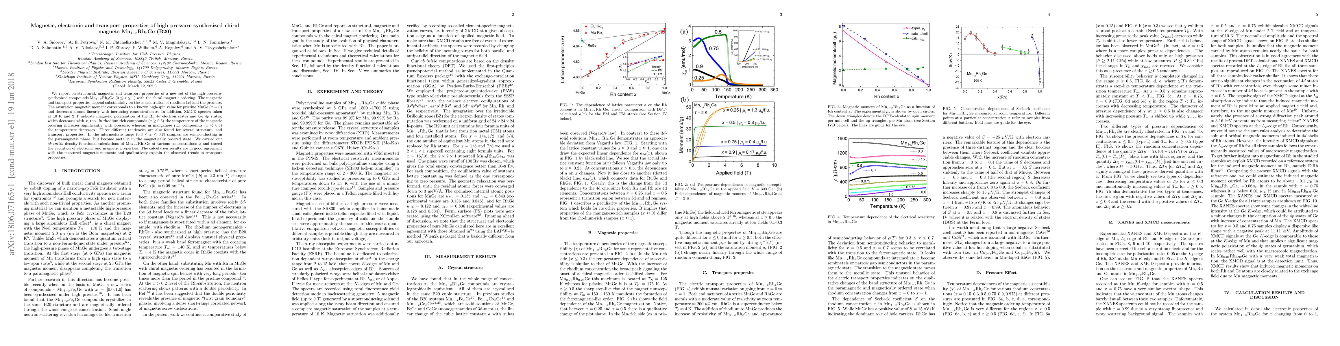 This paper investigates the magnetic, electronic, and transport properties of high-pressure synthesized chiral magnets Mn$_{1-x}$Rh$_x$Ge, finding that these properties vary significantly with rhodium concentration and pressure. The saturation magnetic moment decreases linearly with increasing rhodium concentration, and ab initio calculations support observed trends in transport properties.
