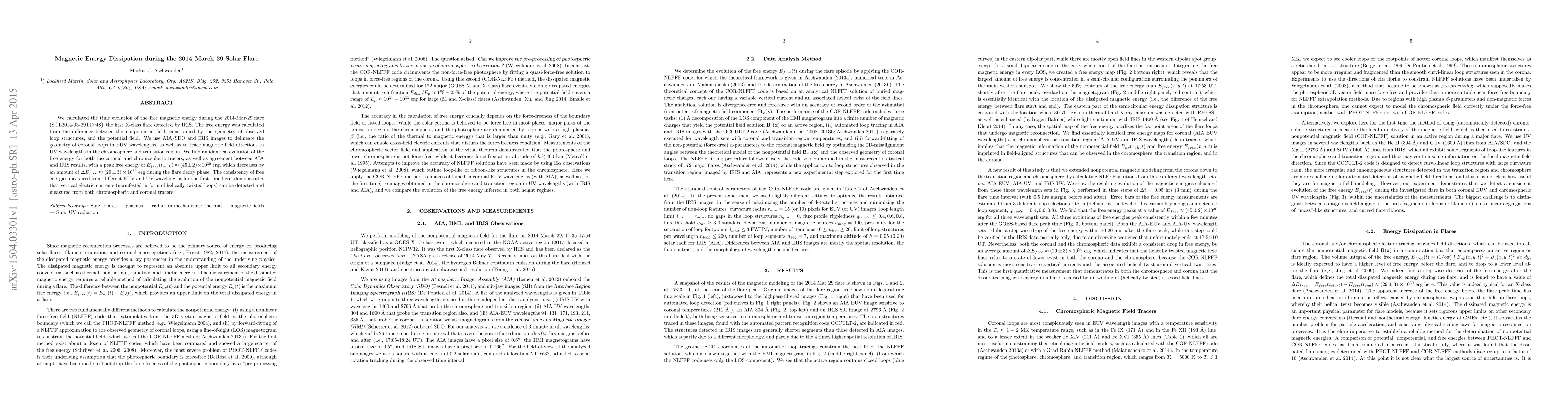 We calculated the time evolution of the free magnetic energy during the 2014-Mar-29 flare (SOL2014-03-29T17:48), the first X-class flare detected by IRIS. The free energy was calculated from the difference between the nonpotential field, constrained by the geometry of observed loop structures, and the potential field. We use AIA/SDO and IRIS images to delineate the geometry of coronal loops in EUV wavelengths, as well as to trace magnetic field directions in UV wavelengths in the chromosphere and transition region. We find an identical evolution of the free energy for both the coronal and chromospheric tracers, as well as agreement between AIA and IRIS results, with a peak free energy of $E_{free}(t_{peak}) \approx (45 \pm 2) \times 10^{30}$ erg, which decreases by an amount of $\Delta E_{free} \approx (29 \pm 3) \times 10^{30}$ erg during the flare decay phase. The consistency of free energies measured from different EUV and UV wavelengths for the first time here, demonstrates that vertical electric currents (manifested in form of helically twisted loops) can be detected and measured from both chromospheric and coronal tracers.