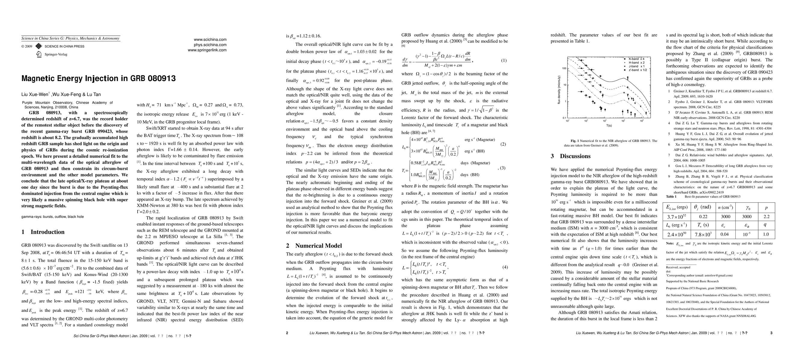 This paper analyzes the gamma-ray burst GRB 080913, the former most distant object, and uses numerical modeling to determine that the late optical/X-ray plateau is due to magnetic energy injection from a massive spinning black hole with super strong magnetic fields.