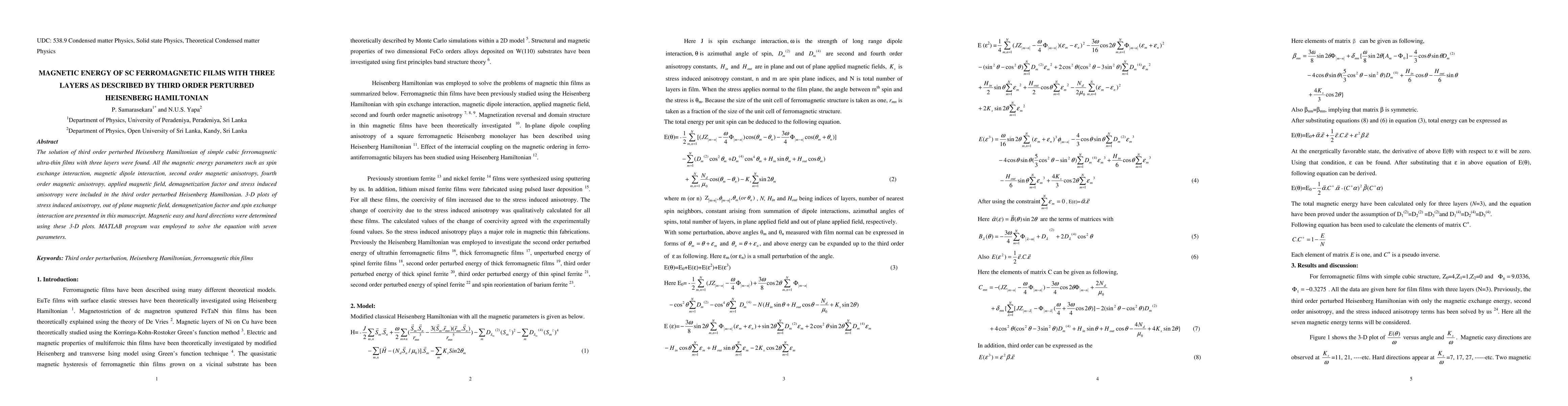 This paper presents the solution for the magnetic energy of three-layer simple cubic ferromagnetic films using a third-order perturbed Heisenberg Hamiltonian. It includes various magnetic energy parameters and employs MATLAB to determine magnetic easy and hard directions through 3-D plots.