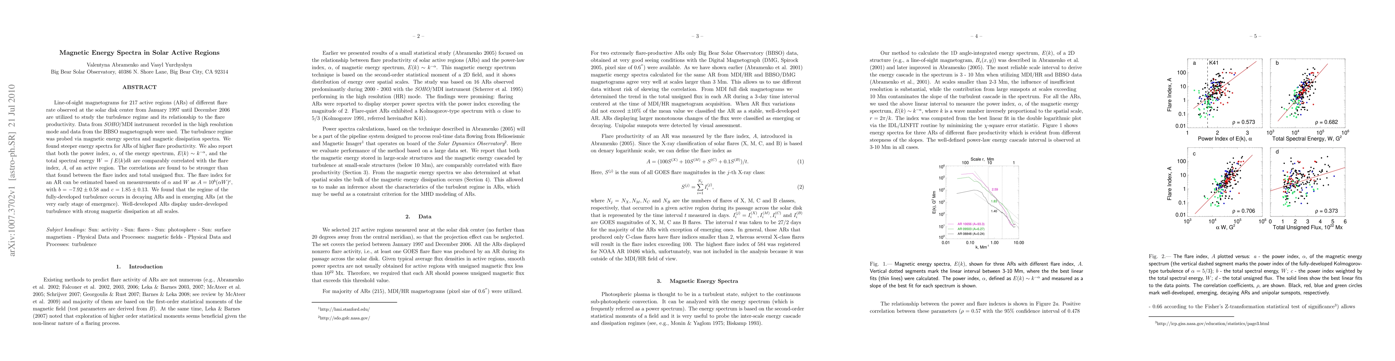 Line-of-sight magnetograms for 217 active regions (ARs) of different flare rate observed at the solar disk center from January 1997 until December 2006 are utilized to study the turbulence regime and its relationship to the flare productivity. Data from {\it SOHO}/MDI instrument recorded in the high resolution mode and data from the BBSO magnetograph were used. The turbulence regime was probed via magnetic energy spectra and magnetic dissipation spectra. We found steeper energy spectra for ARs of higher flare productivity. We also report that both the power index, $\alpha$, of the energy spectrum, $E(k) \sim k^{-\alpha}$, and the total spectral energy $W=\int E(k)dk$ are comparably correlated with the flare index, $A$, of an active region. The correlations are found to be stronger than that found between the flare index and total unsigned flux. The flare index for an AR can be estimated based on measurements of $\alpha$ and $W$ as $A=10^b (\alpha W)^c$, with $b=-7.92 \pm 0.58$ and $c=1.85 \pm 0.13$. We found that the regime of the fully-developed turbulence occurs in decaying ARs and in emerging ARs (at the very early stage of emergence). Well-developed ARs display under-developed turbulence with strong magnetic dissipation at all scales.