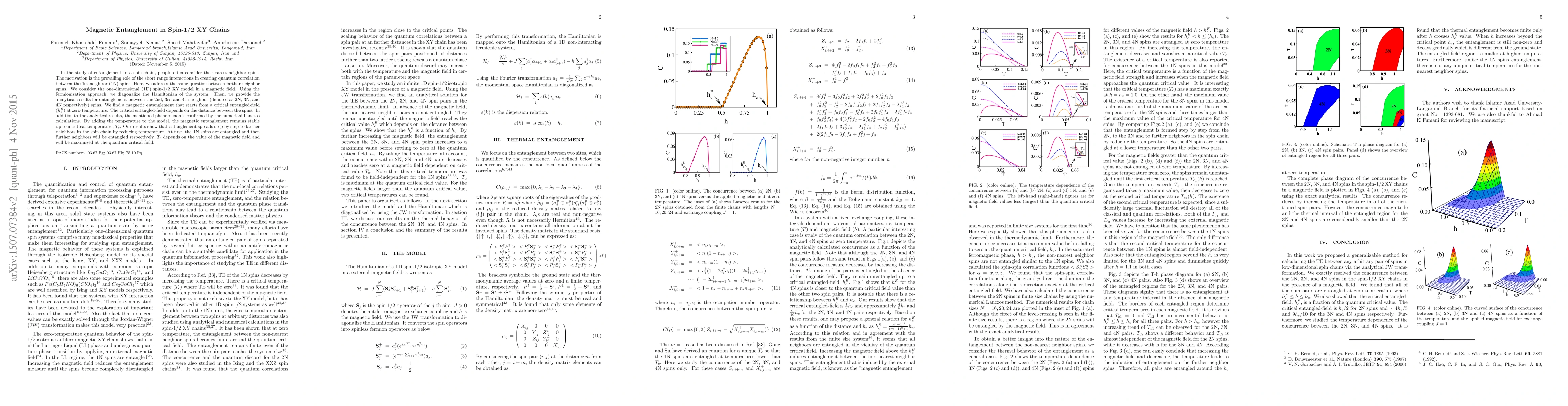 In the study of entanglement in a spin chain, people often consider the nearest-neighbor spins. The motivation is the prevailing role of the short range interactions in creating quantum correlation between the 1st neighbor (1N) spins. Here, we address the same question between farther neighbor spins. We consider the one-dimensional (1D) spin-1/2 XY model in a magnetic field. Using the fermionization approach, we diagonalize the Hamiltonian of the system. Then, we provide the analytical results for entanglement between the 2nd, 3rd and 4th neighbor (denoted as 2N, 3N, and 4N respectively) spins. We find a magnetic entanglement that starts from a critical entangled-field ($h_c^{E}$) at zero temperature. The critical entangled-field depends on the distance between the spins. In addition to the analytical results, the mentioned phenomenon is confirmed by the numerical Lanczos calculations. By adding the temperature to the model, the magnetic entanglement remains stable up to a critical temperature, $T_c$. Our results show that entanglement spreads step by step to farther neighbors in the spin chain by reducing temperature. At first, the 1N spins are entangled and then further neighbors will be entangled respectively. $T_c$ depends on the value of the magnetic field and will be maximized at the quantum critical field.