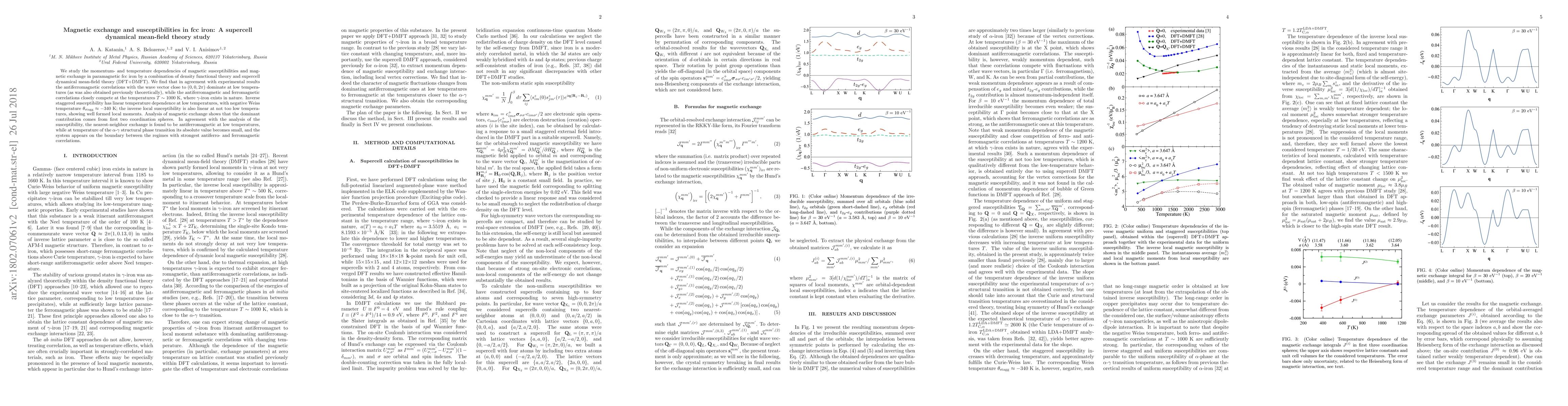 We study the momentum- and temperature dependencies of magnetic susceptibilities and magnetic exchange in paramagnetic fcc iron by a combination of density functional theory and supercell dynamical mean-field theory (DFT+DMFT). We find that in agreement with experimental results the antiferromagnetic correlations with the wave vector close to $(0,0,2\pi)$ dominate at low temperatures (as was also obtained previously theoretically), while the antiferromagnetic and ferromagnetic correlations closely compete at the temperatures $T\sim 1000$ K, where $\gamma$-iron exists in nature. Inverse staggered susceptibility has linear temperature dependence at low temperatures, with negative Weiss temperature $\theta_{\rm stagg} \approx -340$ K; the inverse local susceptibility is also linear at not too low temperatures, showing well formed local moments. Analysis of magnetic exchange shows that the dominant contribution comes from first two coordination spheres. In agreement with the analysis of the susceptibility, the nearest-neighbor exchange is found to be antiferromagnetic at low temperatures, while at temperature of the $\alpha$-$\gamma$ structural phase transition its absolute value becomes small, and the system appears on the boundary between the regimes with strongest antiferro- and ferromagnetic correlations.