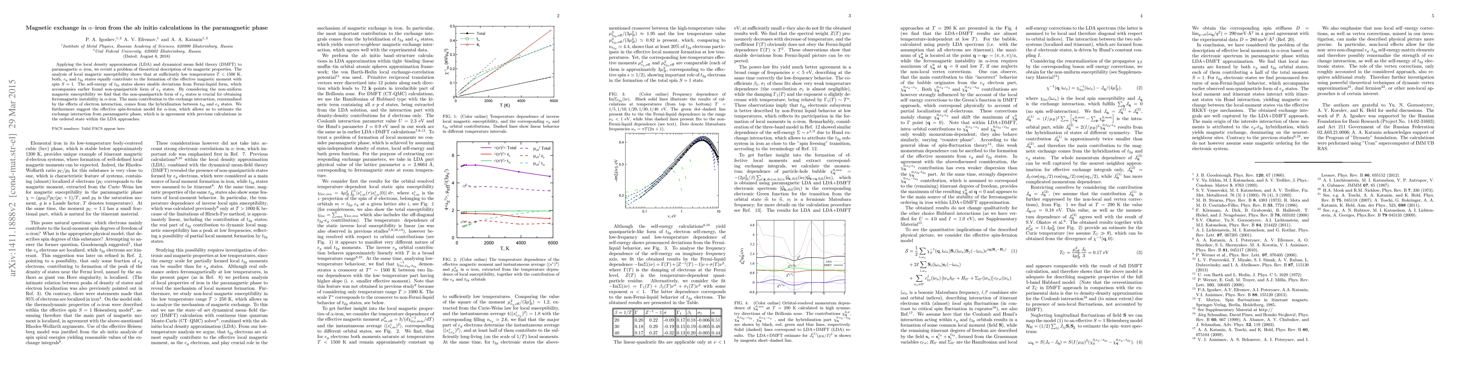 Applying the local density approximation (LDA) and dynamical mean field theory (DMFT) to paramagnetic $\alpha $-iron, we revisit a problem of theoretical description of its magnetic properties. The analysis of local magnetic susceptibility shows that at sufficiently low temperatures $T<1500K$, both, $e_{g}$ and $t_{2g}$ states equally contribute to the formation of the effective magnetic moment with spin S=1. The self-energy of t_{2g} states shows sizable deviations from Fermi-liquid form, which accompanies earlier found non-quasiparticle form of e_{g} states. By considering the non-uniform magnetic susceptibility we find that the non-quasiparticle form of $e_{g}$ states is crucial for obtaining ferromagnetic instability in $\alpha $-iron. The main contribution to the exchange interaction, renormalized by the effects of electron interaction, comes from the hybridization between $t_{2g}$ and $e_{g}$ states. We furthermore suggest the effective spin-fermion model for $\alpha $-iron, which allows us to estimate the exchange interaction from paramagnetic phase, which is in agreement with previous calculations in the ordered state within the LDA approaches.