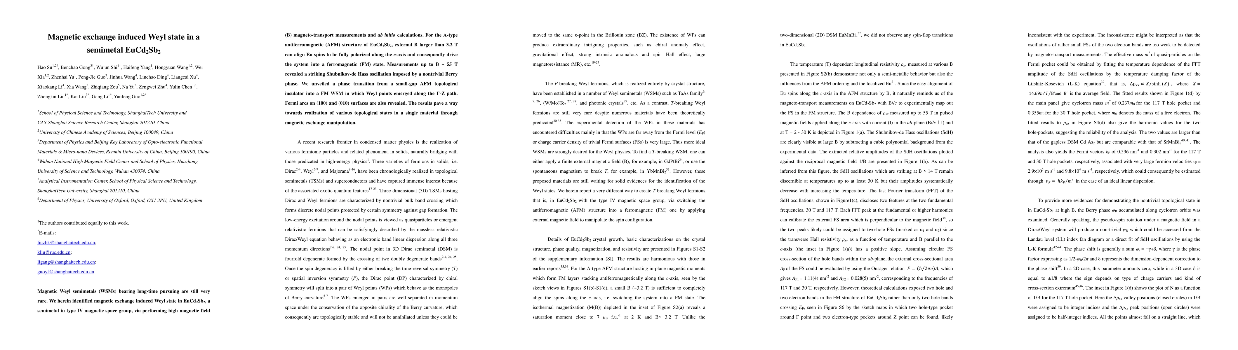 Magnetic Weyl semimetals (WSMs) bearing long-time pursuing are still very rare. We herein identified magnetic exchange induced Weyl state in EuCd2Sb2, a semimetal in type IV magnetic space group, via performing high magnetic field (B) magneto-transport measurements and ab initio calculations. For the A-type antiferromagnetic (AFM) structure of EuCd2Sb2, external B larger than 3.2 T can align Eu spins to be fully polarized along the c-axis and consequently drive the system into a ferromagnetic (FM) state. Measurements up to B ~ 55 T revealed a striking Shubnikov-de Hass oscillation imposed by a nontrivial Berry phase. We unveiled a phase transition from a small-gap AFM topological insulator into a FM WSM in which Weyl points emerged along the {\Gamma}-Z path. Fermi arcs on (100) and (010) surfaces are also revealed. The results pave a way towards realization of various topological states in a single material through magnetic exchange manipulation.