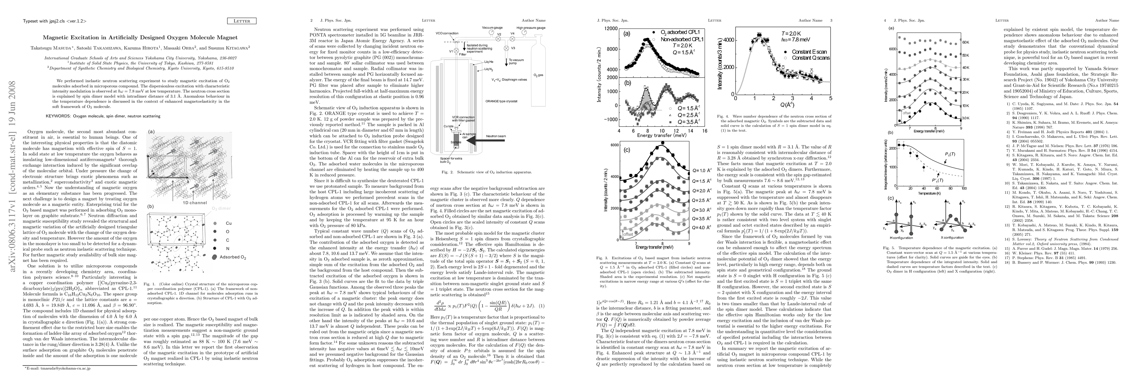 We performed inelastic neutron scattering experiment to study magnetic excitation of O$_2$ molecules adsorbed in microporous compound. The dispersionless excitation with characteristic intensity modulation is observed at $\hbar \omega = 7.8$ meV at low temperature. The neutron cross section is explained by spin dimer model with intradimer distance of 3.1 \AA . Anomalous behaviour in the temperature dependence is discussed in the context of enhanced magnetoelasticity in the soft framework of O$_2$ molecule.