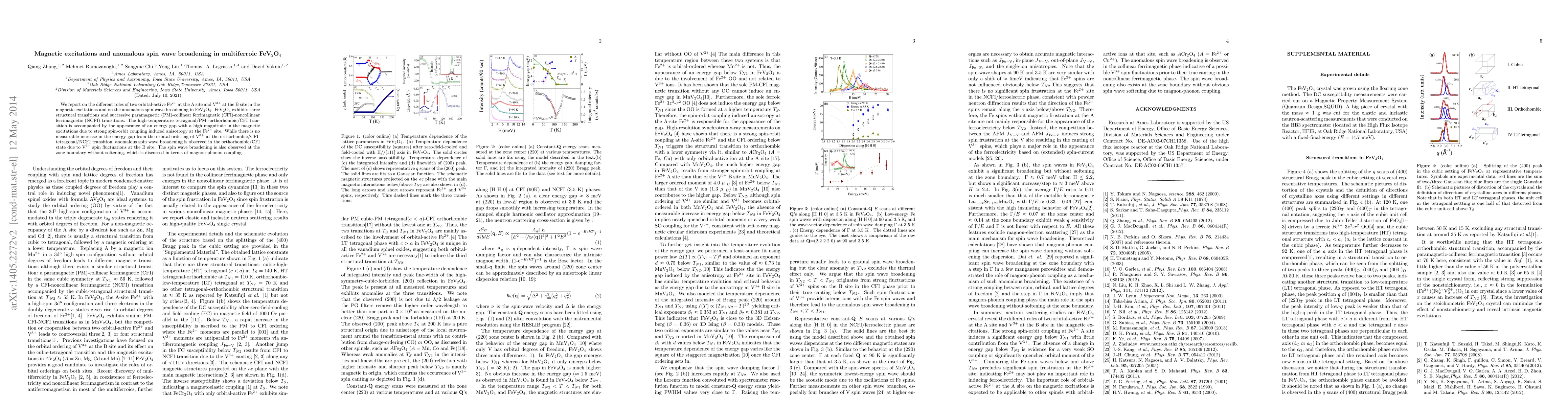This study investigates magnetic excitations and anomalous spin wave broadening in multiferroic FeV$_2$O$_4$, revealing the distinct roles of Fe$^{2+}$ and V$^{3+}$ ions. The material undergoes structural and magnetic transitions, with significant spin-orbit coupling effects at the Fe$^{2+}$ site and V$^{3+}$ spin fluctuations causing spin wave broadening in the orthorhombic state.